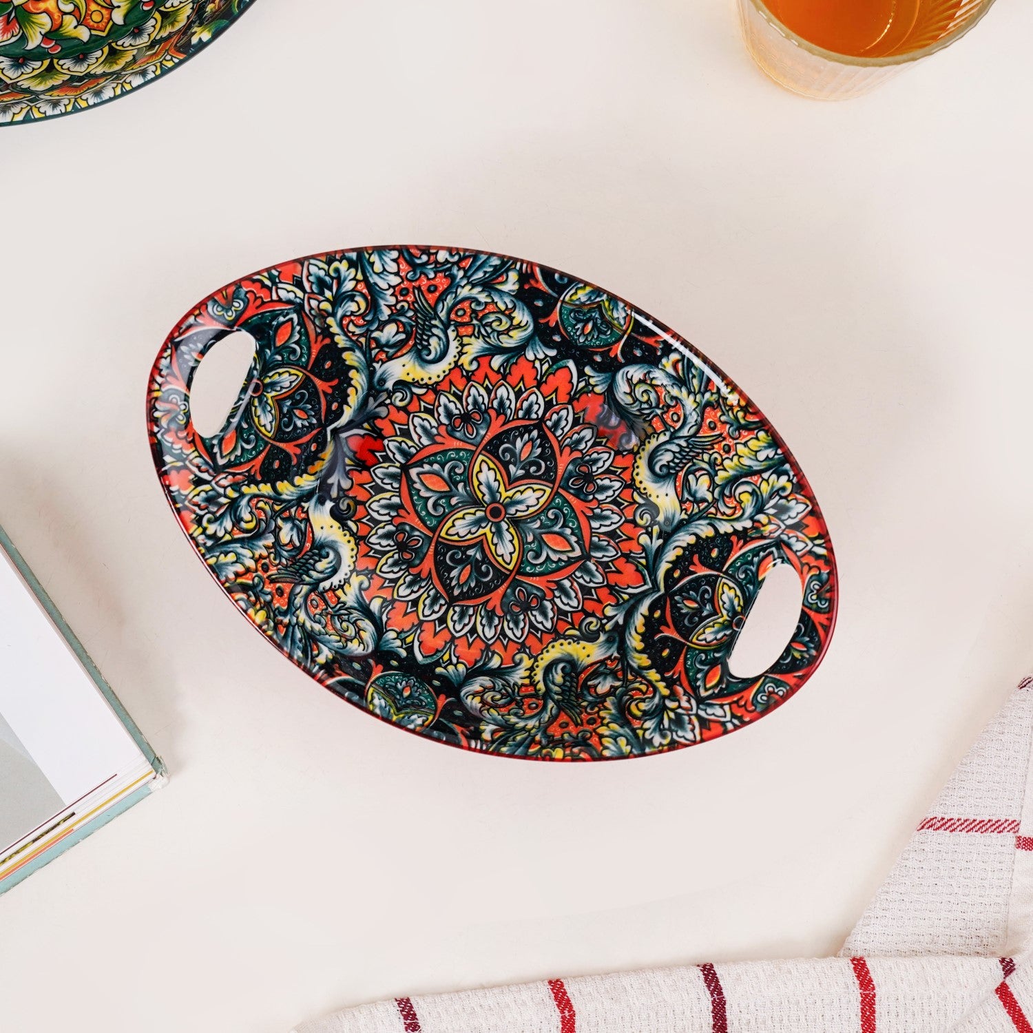Design: This platter's bold red exterior exudes warmth. Intricate white botanical motifs are delicately painted on either side, feeling both rustic and refined. Designed in an elegant ingot-inspired form, the platter has two sleek, oval cutout handles. The interior bursts with a complex paisley-inspired mandala pattern in burnt orange, deep navy, sea green, soft white, and subtle yellow. The central medallion draws the eye inward, creating a dramatic, high-gloss canvas.