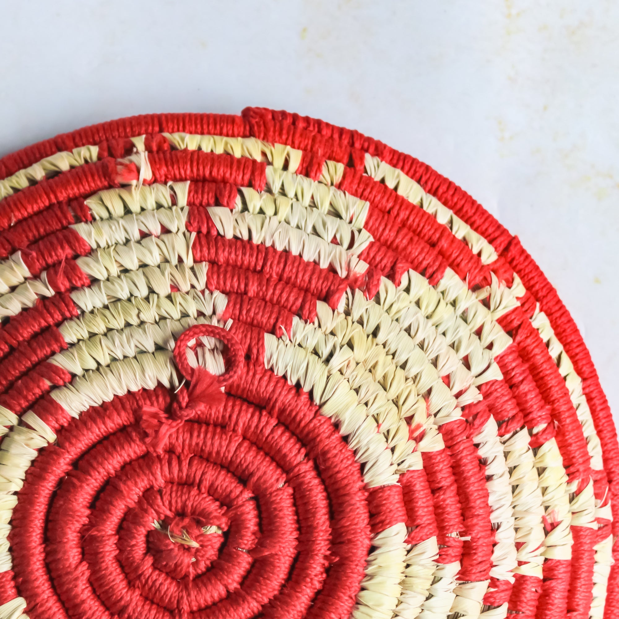 Curved wall decor made of natural Sabai grass with a one of a kind design which stands out in every way possible. The unique wall art is specially handmade by local artisans and is environmentally friendly and ecologically sustainable. The eco friendly wall decor is slightly bent and so it can be also utilised as a shallow fruit basket or a vegetable basket. The mesmerising floral/mandala design is made by using red nylon thread which adds to its appealing factor and uniqueness. The eco friendly basket can also be used as a decorative item on the mantel place and can blend in with almost any sort of decor.