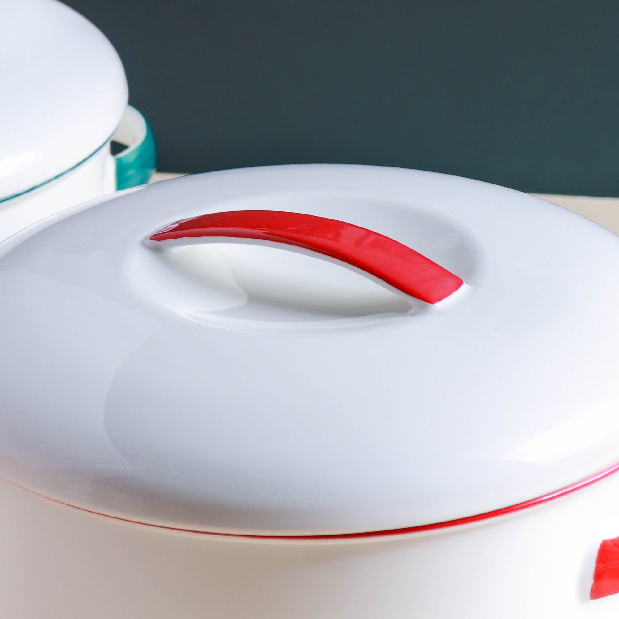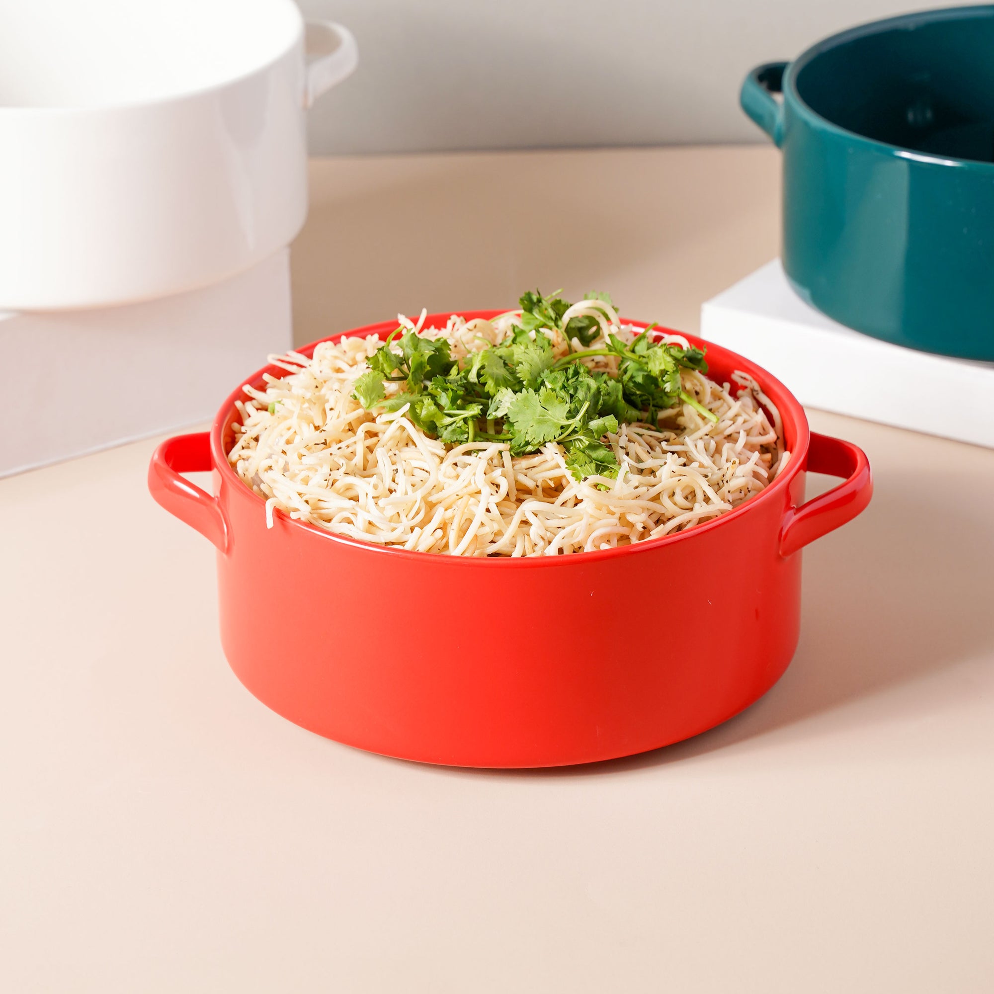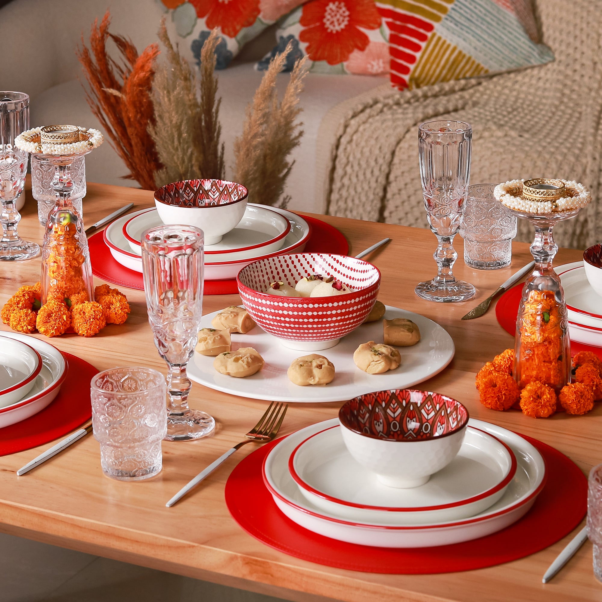 The red Toujours dinner set stands out as an excellent brunch/lunch/dinner companion that would make every event an exciting or joyful one. In the glossy cover of the delicately lavish Toujours, red, a sign of elegance and poise, is perfectly mixed with the mark of refinement. Because of the white hue, the vibrance and color of the dish will seem extra wonderful and picture-worthy when served on it. The red Toujours dinner set includes six dinner plates, six appetizer plates, six soup bowls, six soup spoons, two white serving bowls, one red serving bowl, three serving spoons, and one casserole.
