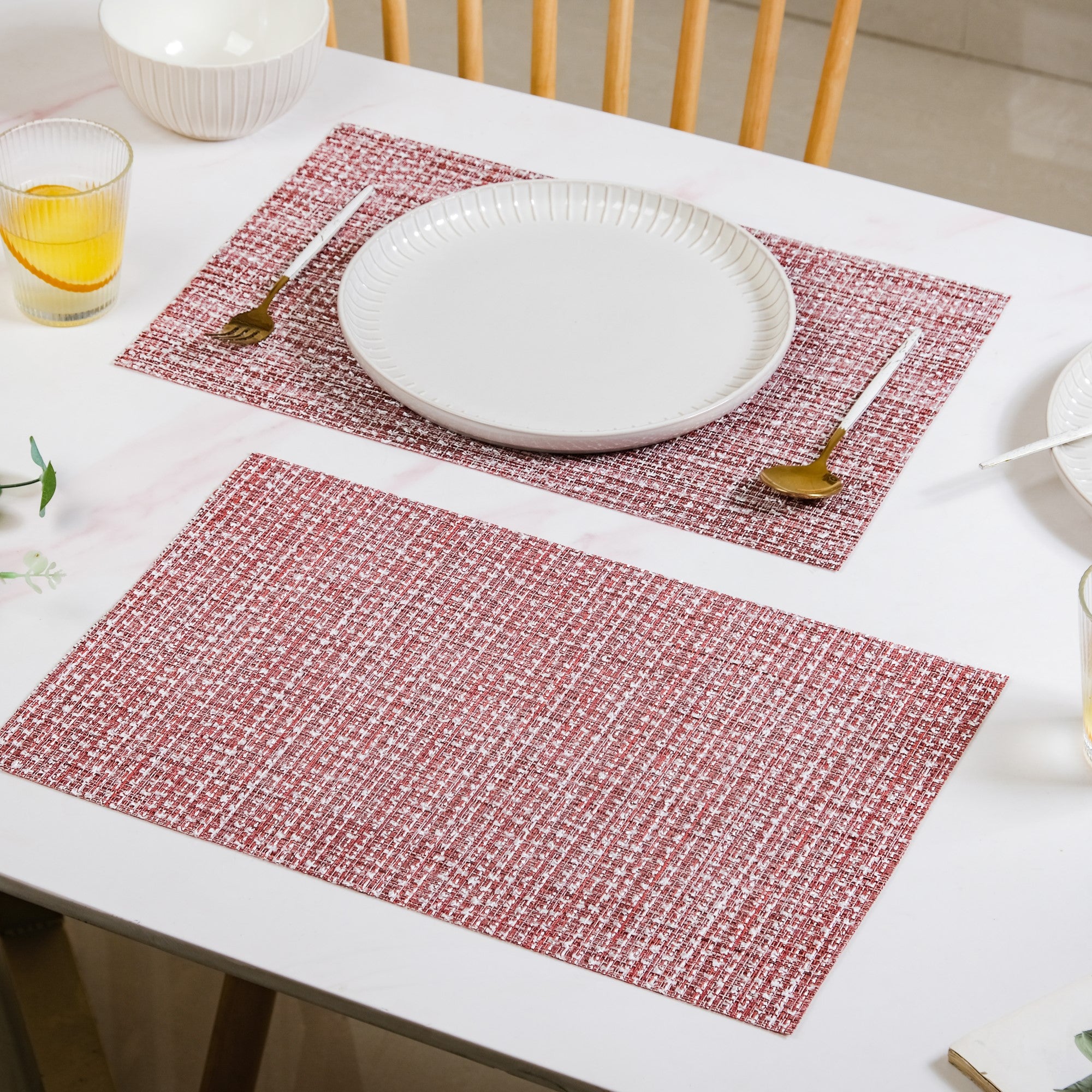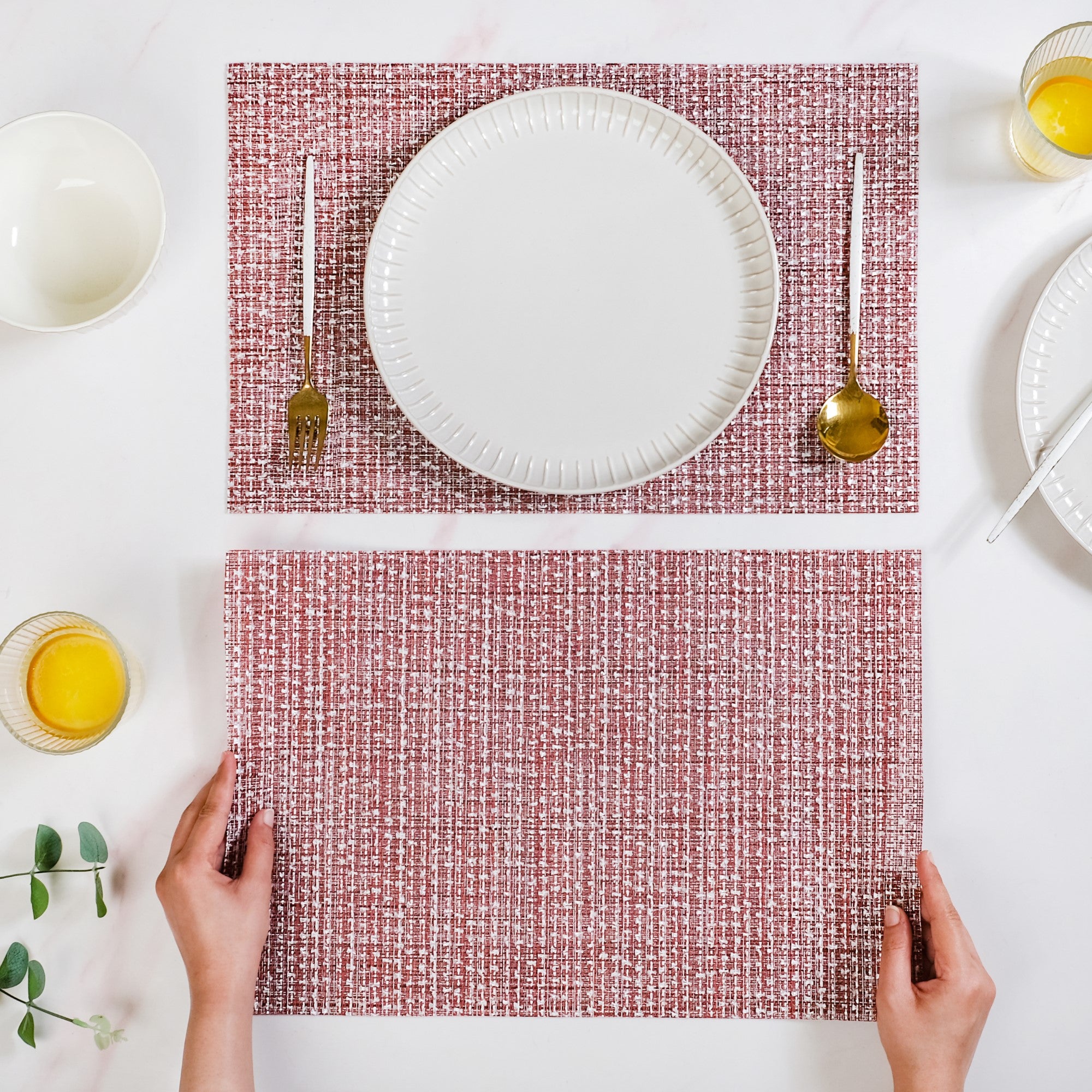 Design: This set features a unique crosshatch appearance with a tight, grid-like weave that adds texture and sophistication to your table. These dining table placemats are made from durable PVC, ensuring both long-lasting use and easy cleaning. The set includes six placemats, perfect for everyday meals or special occasions. The reversible design adds versatility, allowing you to change up your table setting with ease. With a textured surface, these placemats stay securely in place, preventing any slipping during meals.