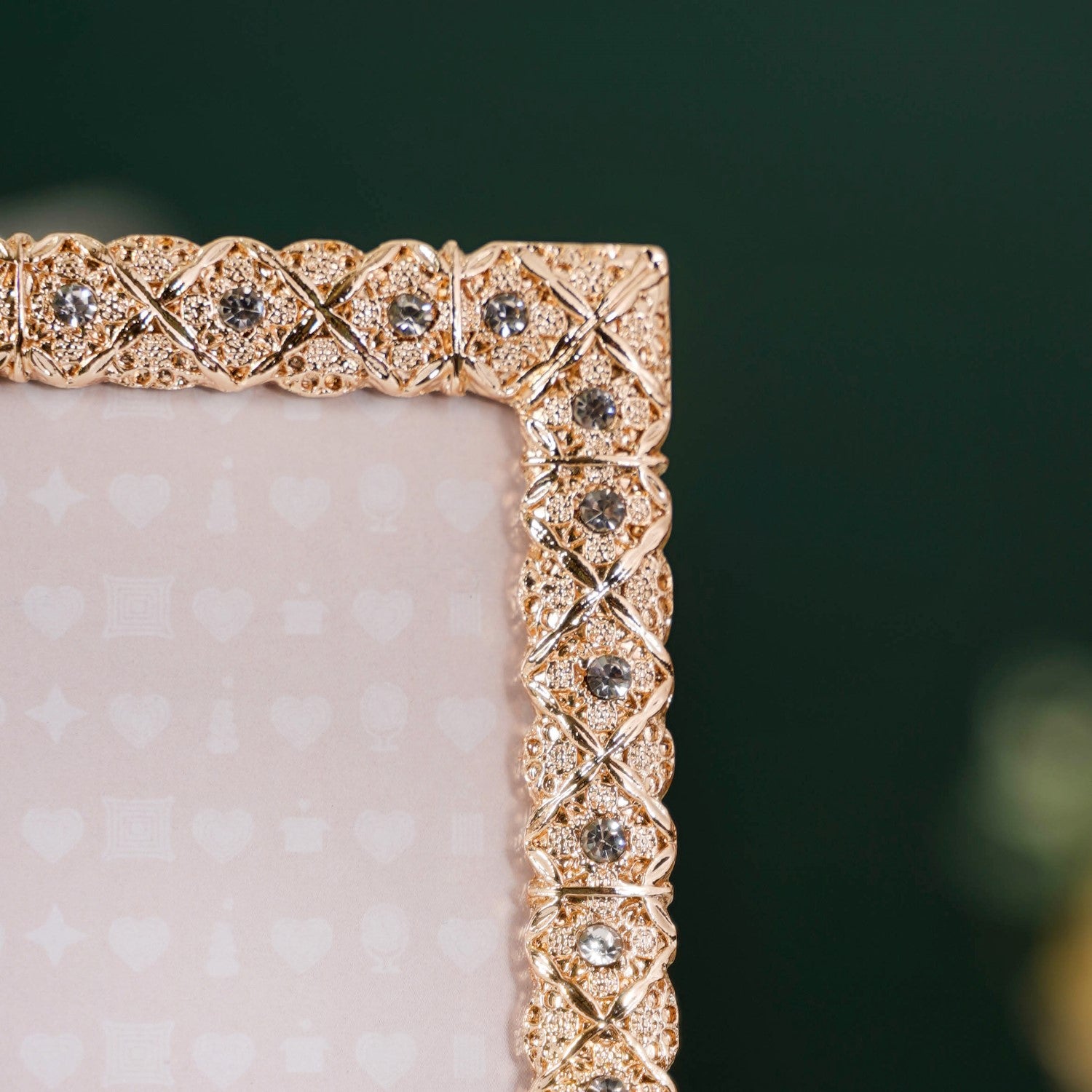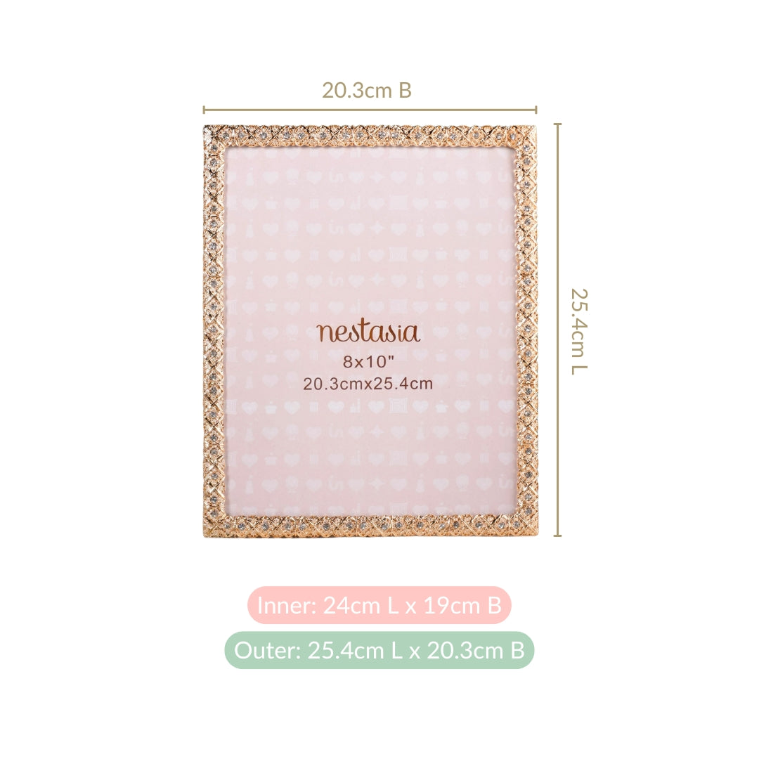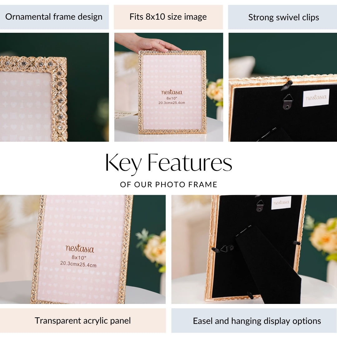 Design: rafted from premium metal, the 8x10 frame boasts a striking diamond-lattice border in high-polish gold, adorned with sparkling clear rhinestones for added depth and shimmer. Your standard 8x10" photo is protected behind a clear acrylic sheet and cushioned with a soft velvet backing. Durable rotatable hooks allow for effortless wall display in either orientation, while a sturdy easel stand with satin-secured support ensures reliable tabletop placement. Swivel clips and screws keep your image securely in place.