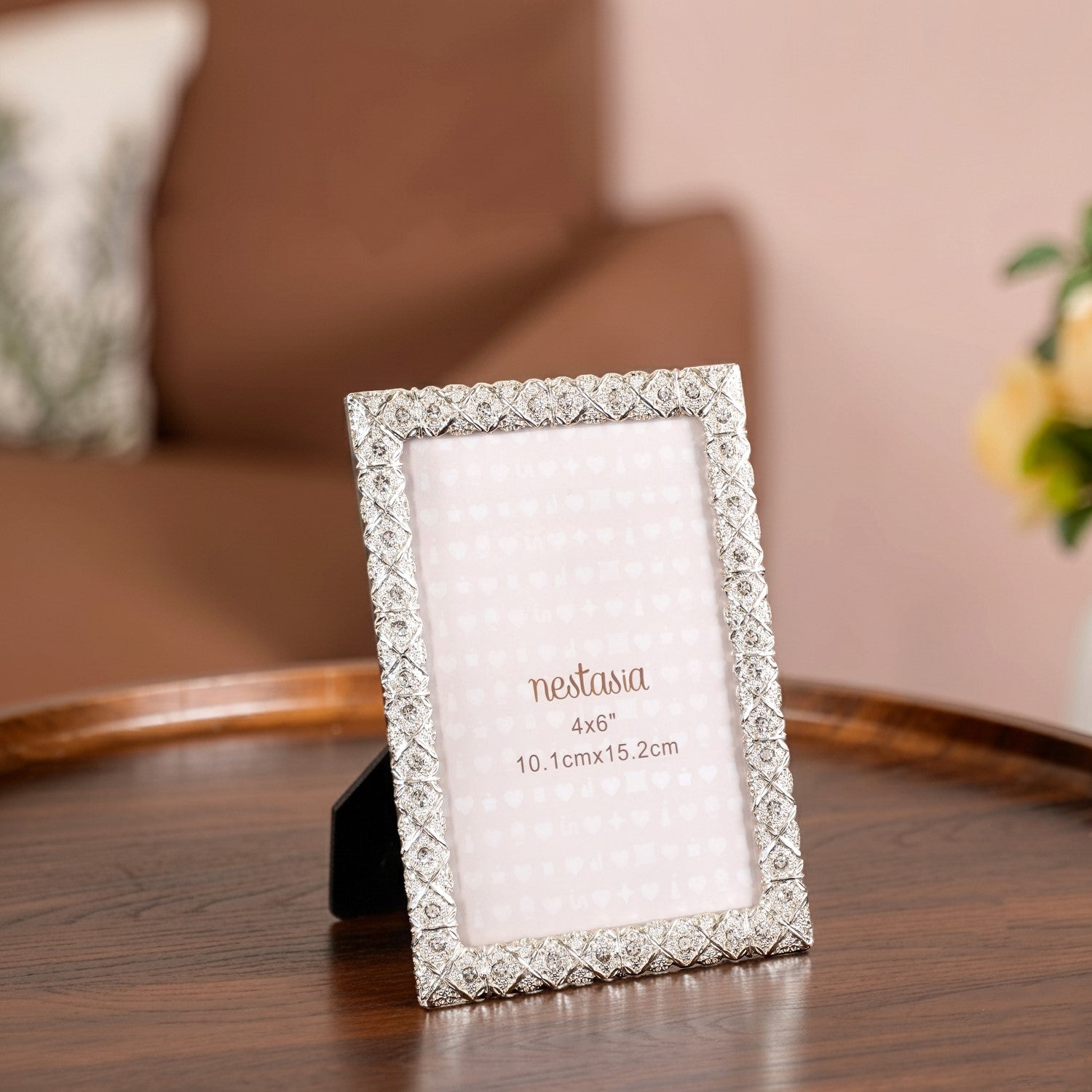 Celebrate your treasured memories with this luxurious silver photo frame, designed to add elegance and sparkle to any space. Its shimmering rhinestones and polished metal finish instantly turn your favourite photos into stunning focal points. This frame is perfect for displaying 4x6" photos.