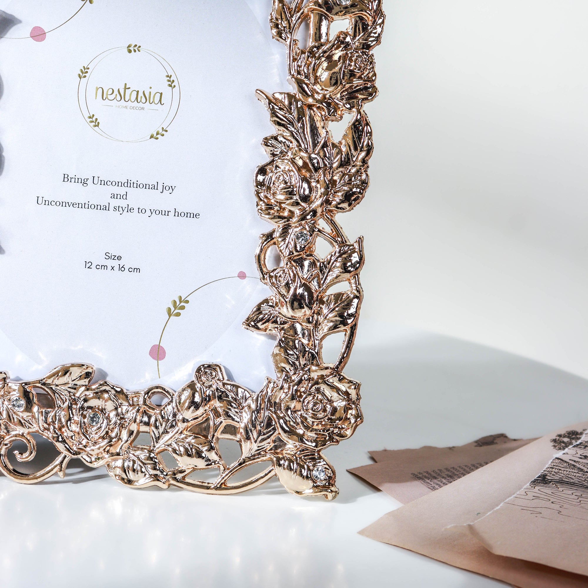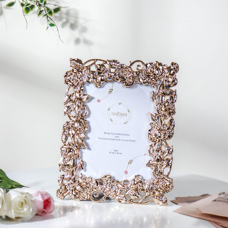 Doing something for the first time always leaves one with a truckload of memories. Be it going hiking, learning to cycle, cooking, as simple as taking the first walk as a toddler. One instinctively wishes to preserve such significant moments and capture them all in the form of photographs. The flora-themed photo frame is a perfect way to protect all precious photographs of the past. Flowers in glittery gold inlaid on each side magnify the aesthetic appeal of the picture frame. Nestip: One can use the photo frame to house the memories of when one first started school. Size: 23cm L × 18cm W Colour: Golden Material: Metal and PVC Products Included: 1 photo frame Style: DYFA77PF37