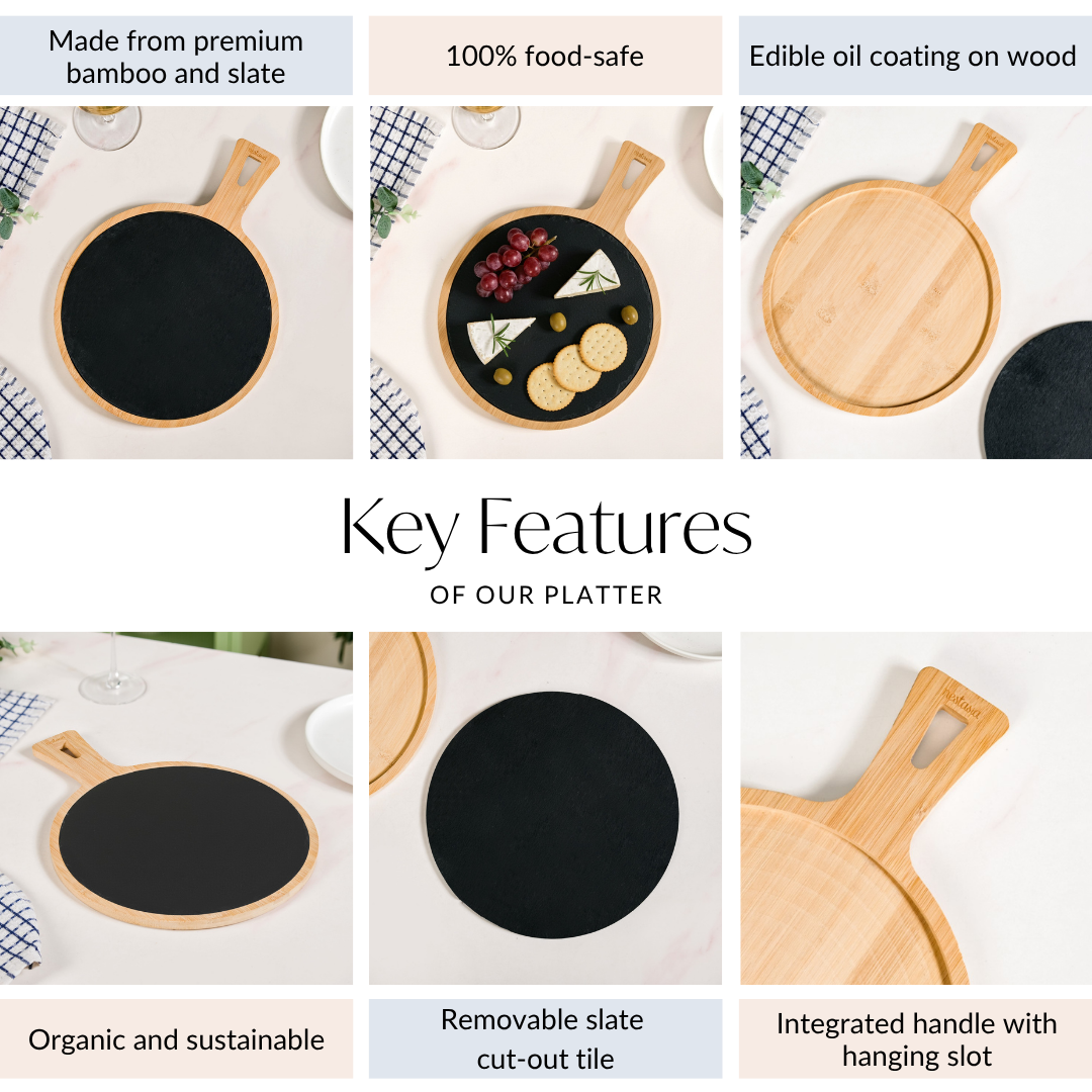 Design: Crafted with a round bamboo frame and a sleek slate, this serving platter is a stunning addition to your dinner table! The bamboo platter features an engraved slot that holds the round slate in place. The warm brown tones of bamboo contrast beautifully with the matte black slate, creating a statement piece for any table setting.