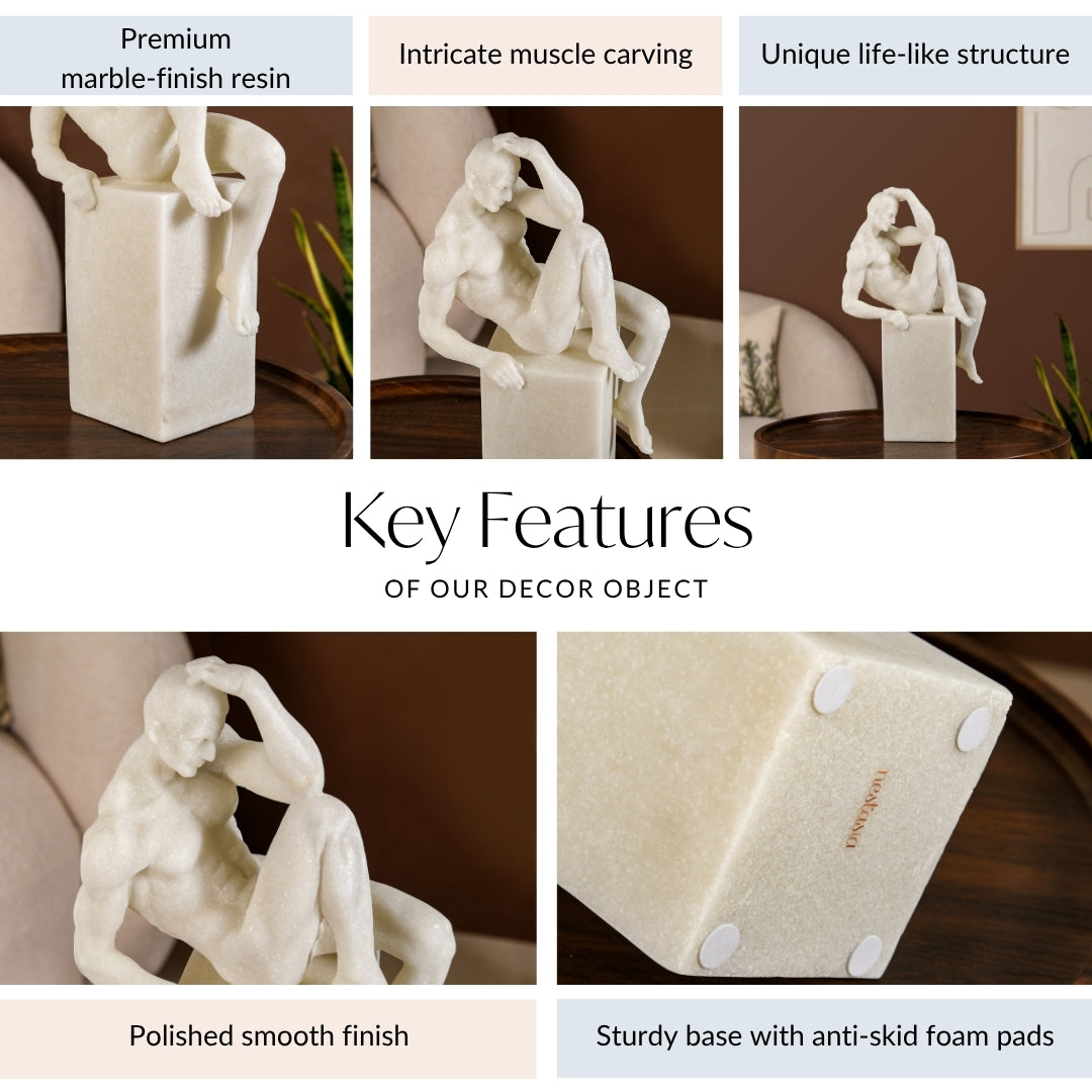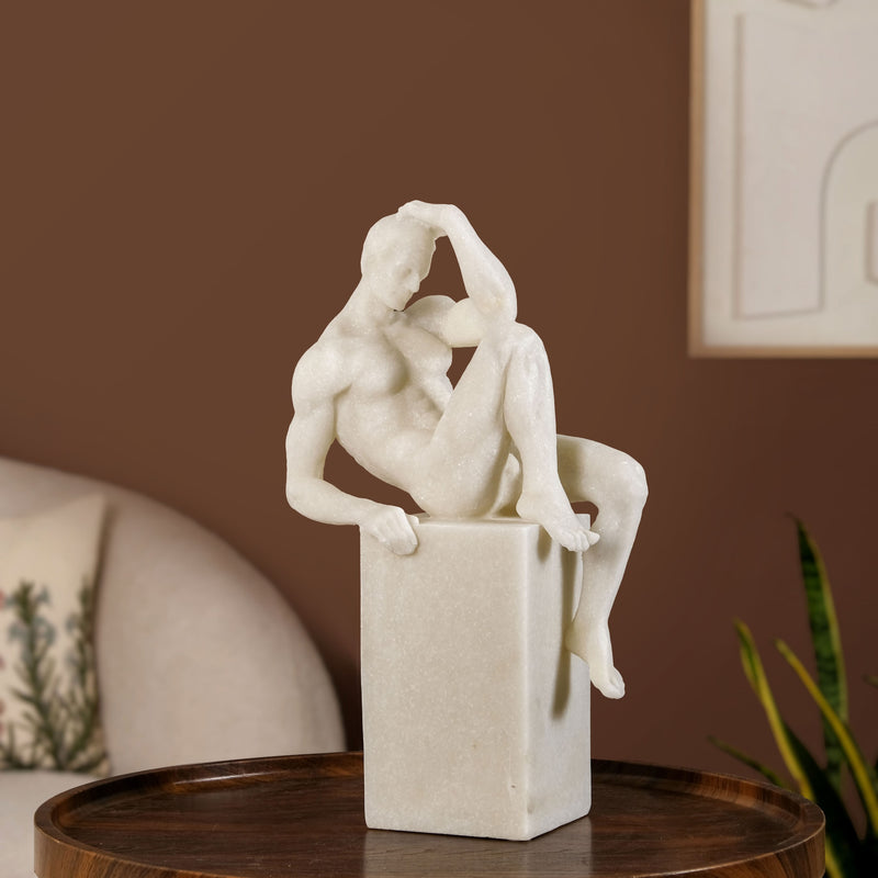 Design: The sculpture is crafted from premium resin, which gives it a faux marble-like finish, and features finely carved muscles that highlight the human body’s structure. A smooth, polished finish enhances the refined texture, while the reclining male figure rests thoughtfully on a rectangular pedestal. The lustrous white surface with subtle sheen offers durability, elegance, and a classical design suitable for both modern and traditional spaces.