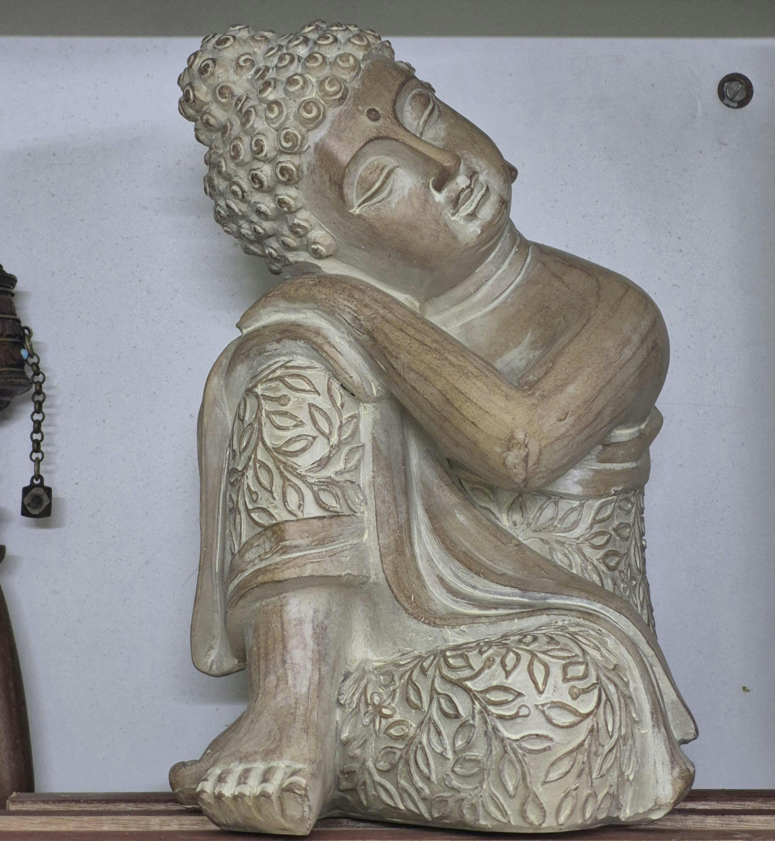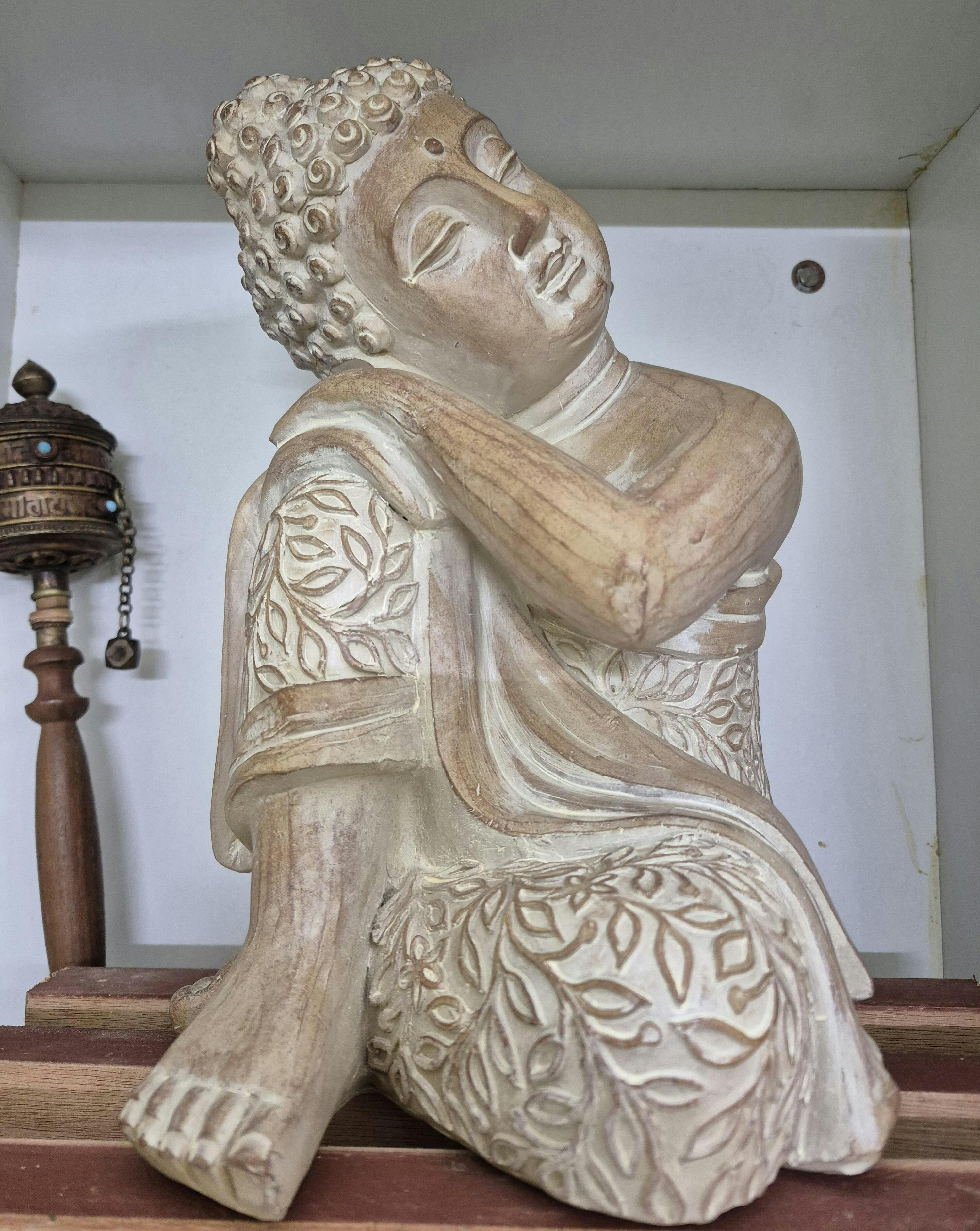 The Buddha is depicted in a serene and contemplative posture, resting his head on his hand in a gesture of introspection and tranquillity. It symbolises inner peace, mindfulness, and spiritual awakening, inviting viewers to cultivate a sense of self-awareness in their own lives.