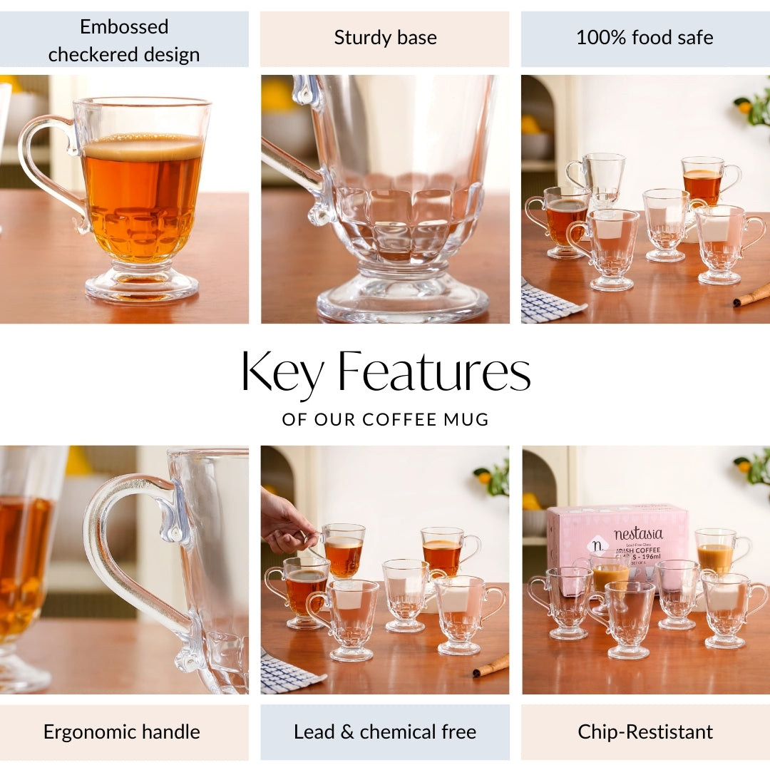 Benefits: This set of 6 Irish coffee glasses is perfect for serving everything from lattes to cocktails. The ergonomic handles ensure easy grip, while the pedestal base keeps drinks steady. The versatile size works equally well as glass coffee cups for daily use or as elegant coffee glassware for hosting guests. Stylish yet functional, these glasses transform everyday sipping experiences.