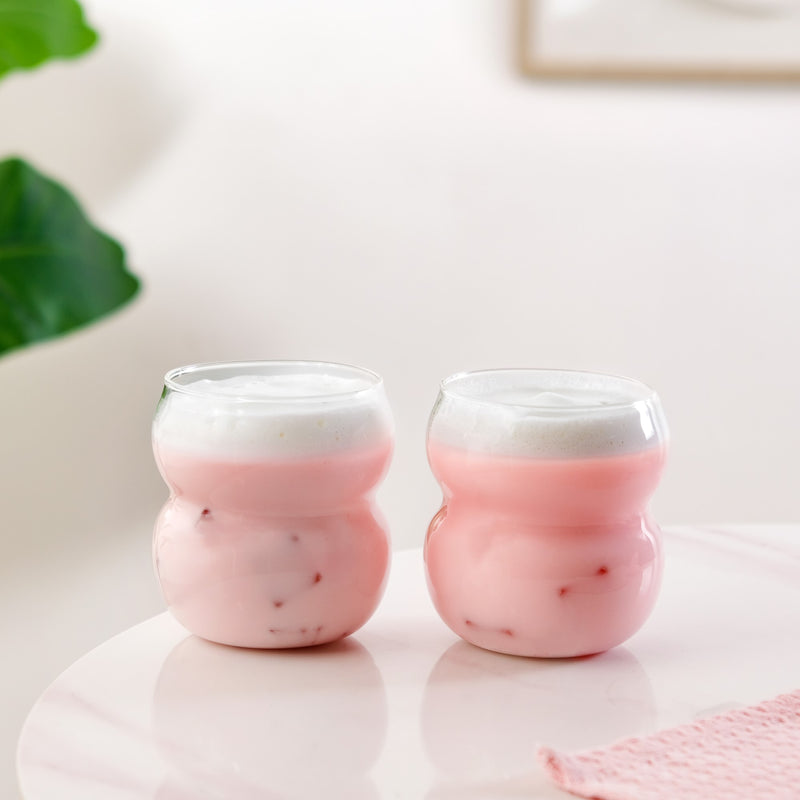 Design: These tumblers are crafted from high borosilicate glass, known for its clarity and strength. The silhouette features two smooth curves that create a cinched centre, offering both style and comfort. Their cylindrical shape tapers subtly at the waist for an easy grip. The surface is smooth and transparent, letting the drink inside become the highlight. The rim is polished and slightly rounded for a comfortable sip. Each tumbler has a balanced weight that feels steady when placed on any surface.