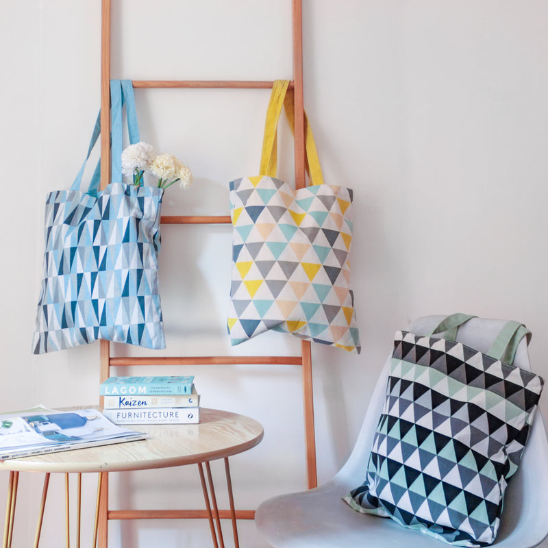 Reversible tote bags that come with geometric prints, are tote bags that come with geometric prints on one side and solid colours on the other. The cotton bags can be used as a shopping bag, college bag or even a storage bag that is a good alternative for plastic bags. The bag can be used multiple times with a completely different look when used on either of the sides. The geometric prints on one side of the bag give it a modern look. The bags can be hand washed or wiped for cleaning.
