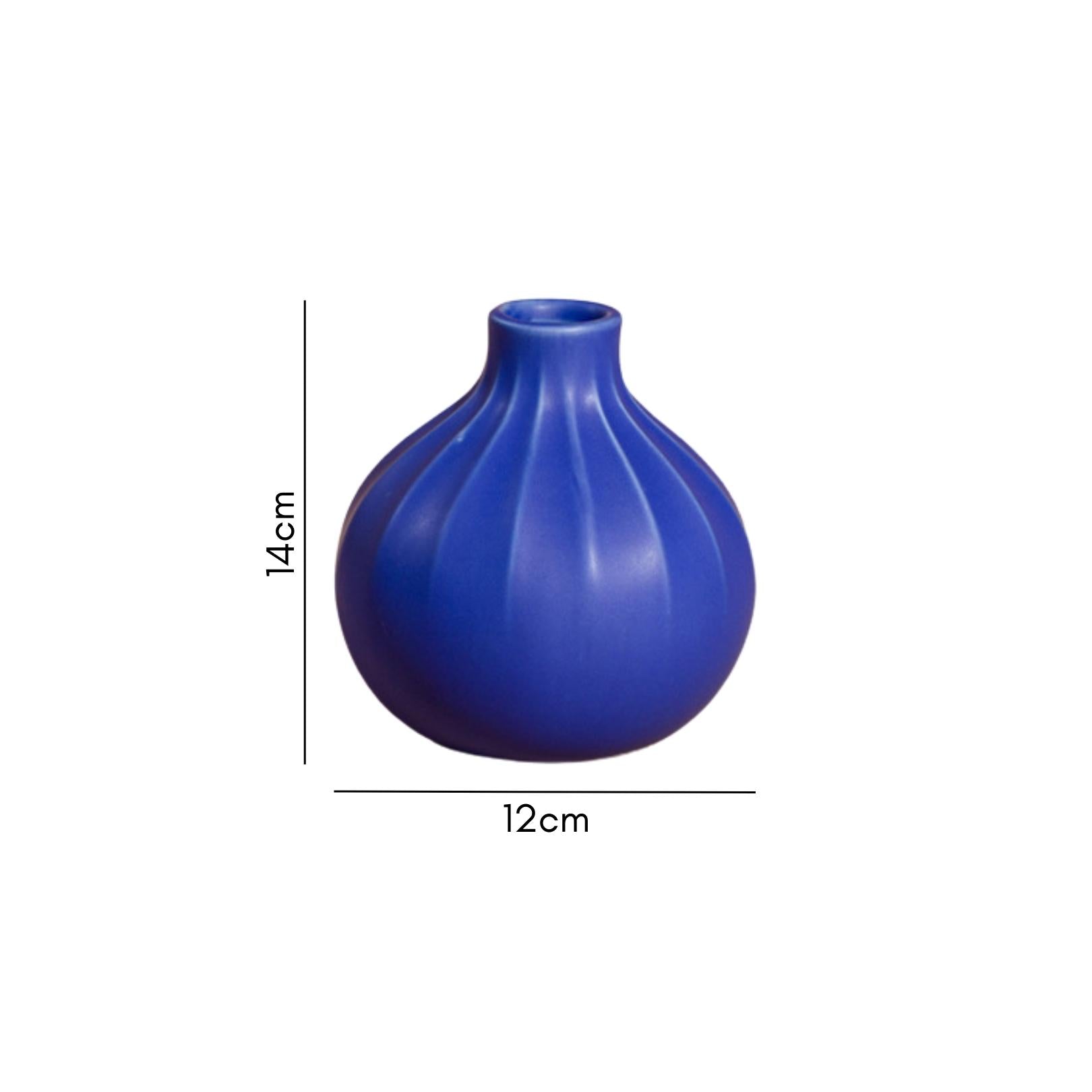 Size: 12 cm D x 5 cm D (base) x 14 cm H Color: Dark blue Material: Ceramic Products included: 1 vase Style: Vnov131