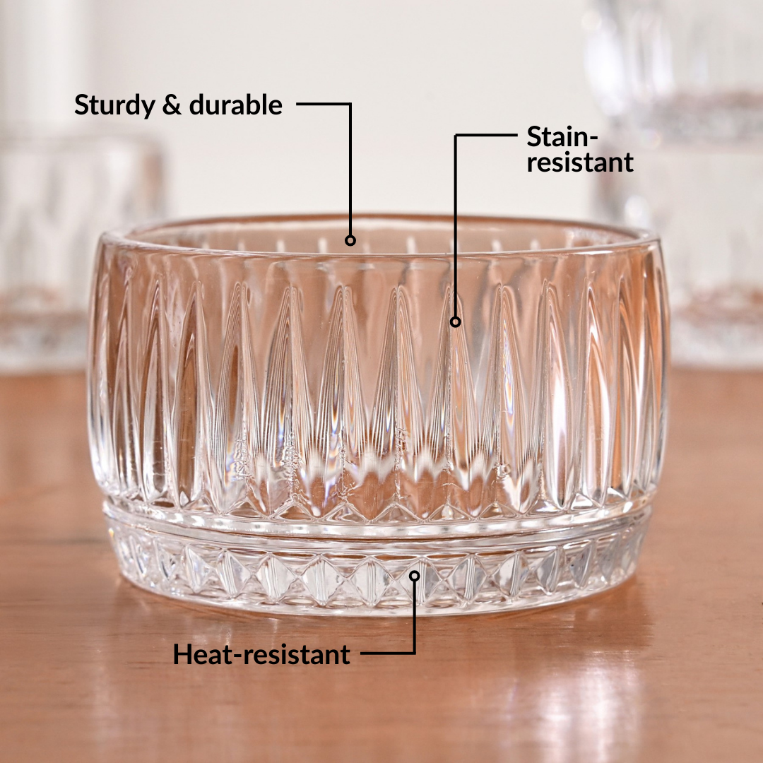 Design: Crafted from premium lead-free glass, this transparent dessert bowl set features a refined ribbed body complemented by abstract diamond-cut detailing along the lower rim. The set is perfect for serving delicious curry, dals, or even dips! Its design is completed with an elegant floral cut-out base, while the glossy, clear finish highlights every intricate detail. The set comes in a beautiful gift-ready box.