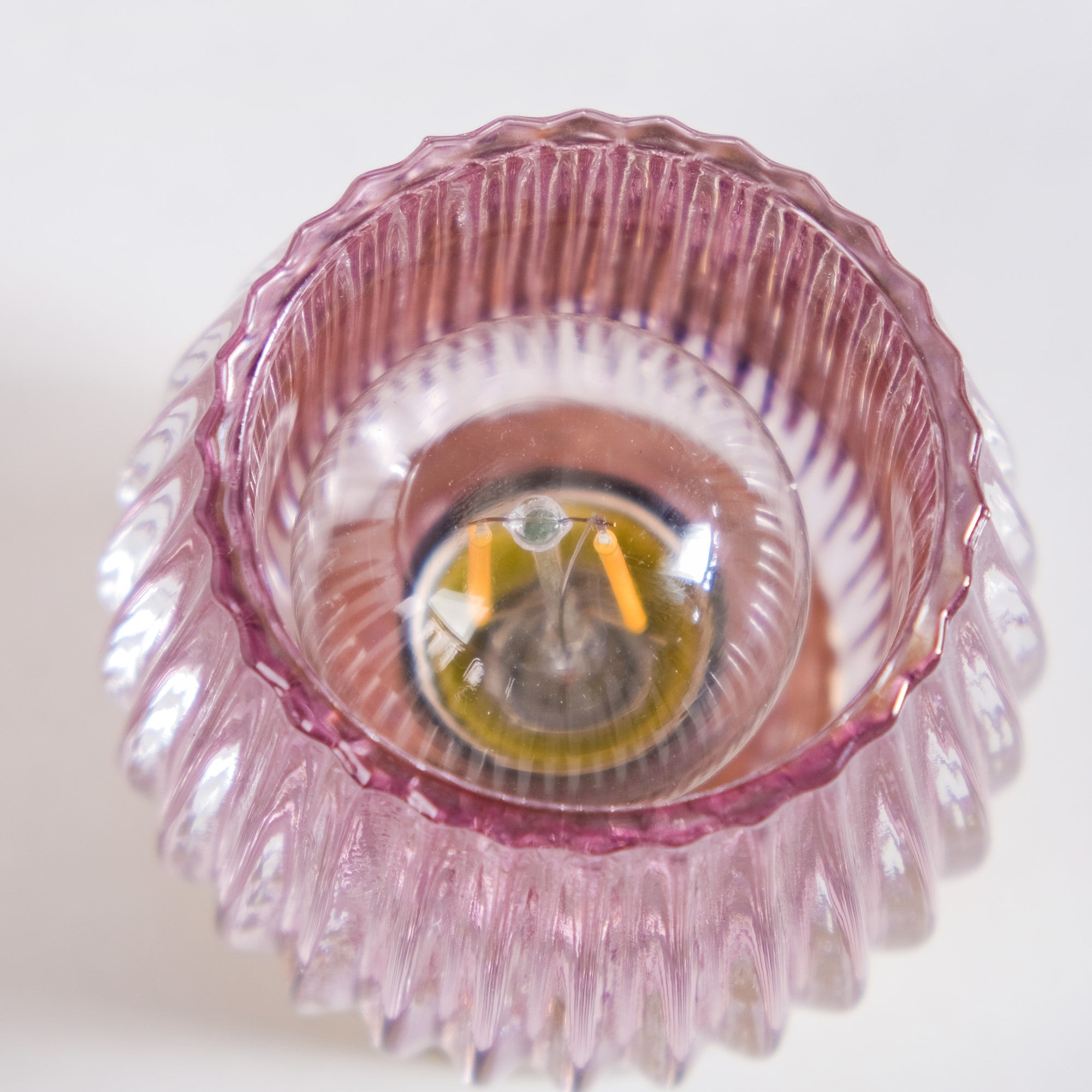 0.3W Edison LED bulb with tungsten filament (included) E27 bulb base with screw socket High brightness, low power consumption Metal base with battery socket & power button Requires 2 AAA batteries to operate (not included) Tulip-shaped tinted purple ribbed soda-lime glass Lamp capacity of 24 hours