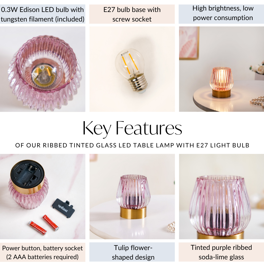 Design: Featuring a tulip-shaped purple-tinted glass with ribbed detailing, the desk lamp’s elegant form adds a touch of charm to any room. The 0.3-watt Edison LED bulb with a tungsten filament casts a warm, ambient glow, creating a cosy atmosphere. Its compact, metal base holds a power button for easy operation and complements the classic yet contemporary design.