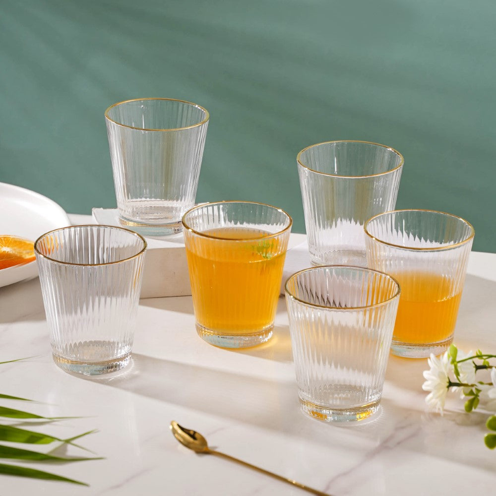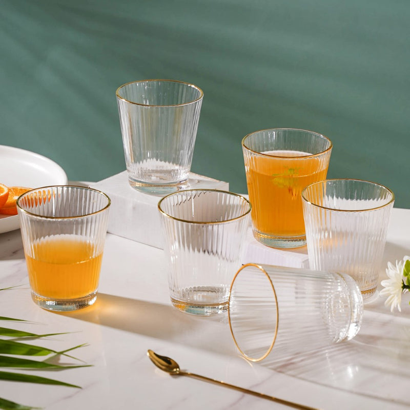 Our drinkware collection comes with a range of stunning designs, making the drinking glasses and tumblers ideal for a fancy sipper spread. At the same time, the sturdy and lightweight design of the glassware pieces makes them pretty convenient for daily use. The toughened tempered glass material of our drinkware pieces also makes them resistant to chipping and cracking. You can use the tumblers to serve drinks and refreshments to guests. The textured glass tumblers can also double as a pen stand for your study desk.