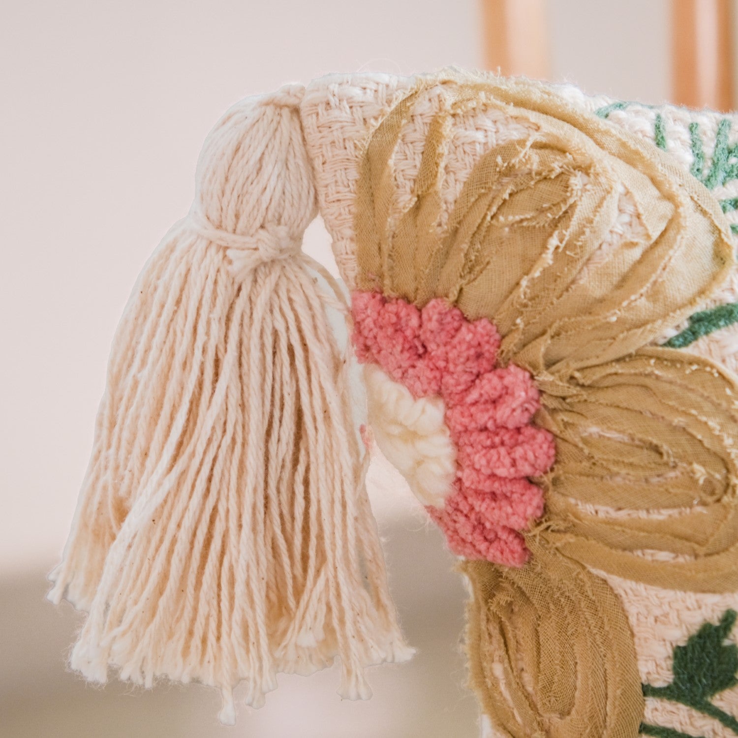 The cushion cover is not reversible, as the embroidered designs are only visible on the front side. The other side features a solid-colored cotton base, offering a contrasting but non-embellished look.