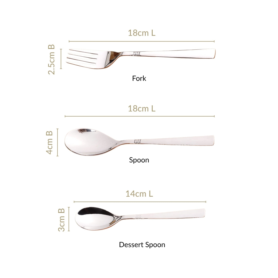 Design: Add elegance to your dining experience with this stainless steel cutlery set, featuring six dinner forks, tablespoons, and dessert spoons. Crafted from high-quality, rust-resistant stainless steel, each piece showcases a sleek, mirror-polished finish and a modern silhouette with subtle triple-ring detailing near the neck for visual appeal. The handles are straight, squared, and slightly tapered, lending a modern, streamlined aesthetic to the set. Moreover, this set comes with a beautiful pre-packed box!