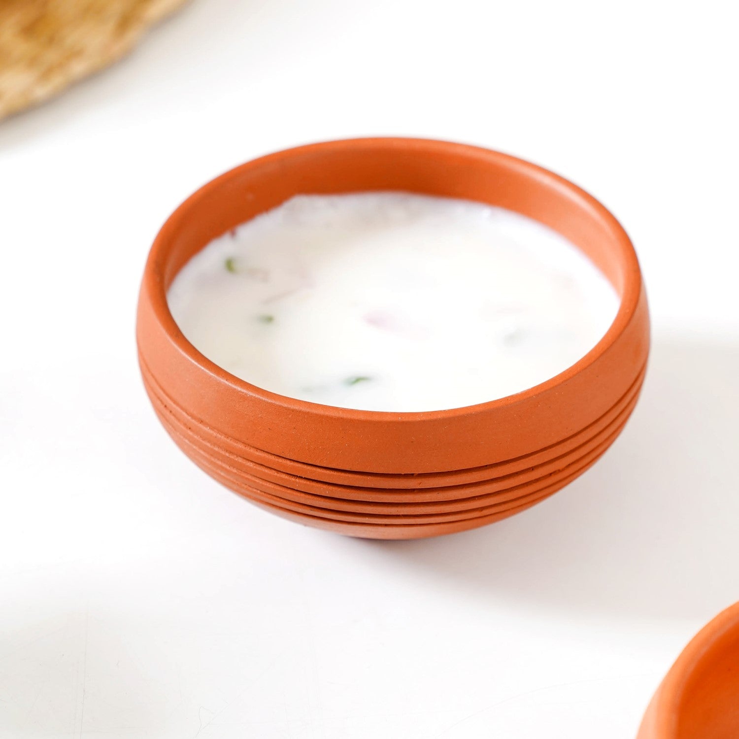 Benefits: Designed from mineral-rich earthen clay sourced from the sublime Ganga basin, our set of 4 dessert bowls is 100% sustainable and eco-friendly. Embracing these principles, they are entirely inert, unglazed, and chemical-free, so that you can enjoy the purity of the earthenware. The porous nature of the earthen clay absorbs and retains moisture, keeping your desserts cool and fresh for an extended period. The bowls provide excellent insulation, maintaining the perfect temperature for your sweet treats. But there are benefits in store! The clay's natural minerals are gradually released into your food, offering health benefits that go beyond taste. These minerals, being alkaline, help to neutralise the acids in the contents, balancing the pH levels and promoting better digestion. Plus, the earthy aroma that the clay imparts to your desserts adds an extra layer of sensory delight, making every bite a truly indulgent experience.