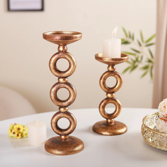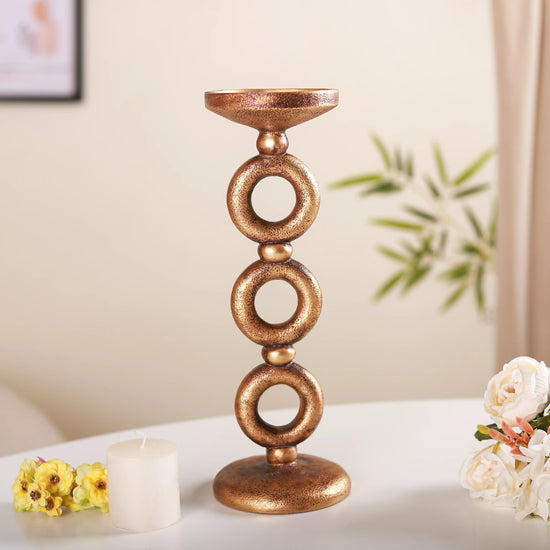 Transform your living space with our golden candle stand. Crafted to perfection, the candle holder features three vertically aligned rings that create a captivating visual display. The rustic golden colour infuses a touch of antique charm, enveloping your space in a warm and sophisticated ambience. Meticulously designed with intricate attention, this candle stand effortlessly becomes the focal point of any room, drawing admiration and intrigue. Adorn it with pillar candles, and witness the enchanting play of flickering flames casting a soothing, ambient glow that transforms your surroundings.
