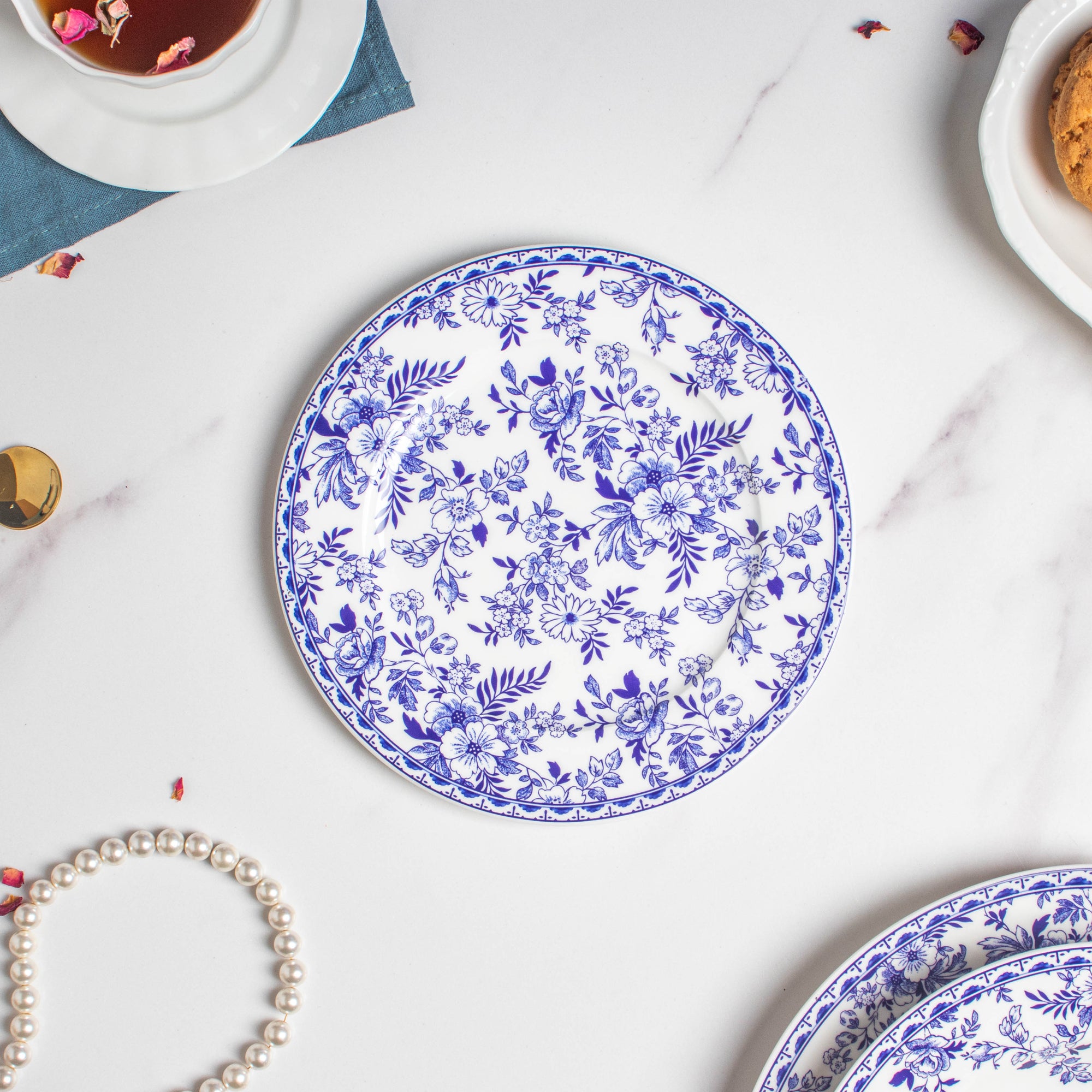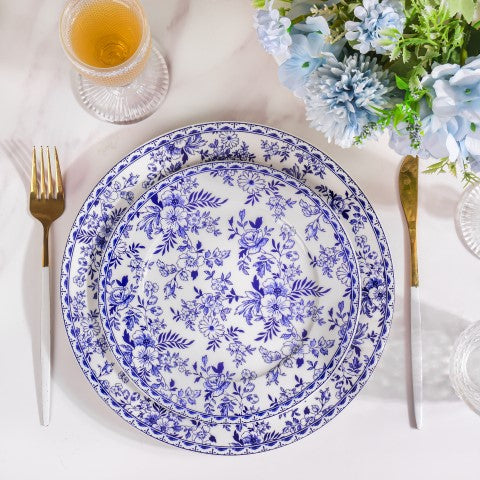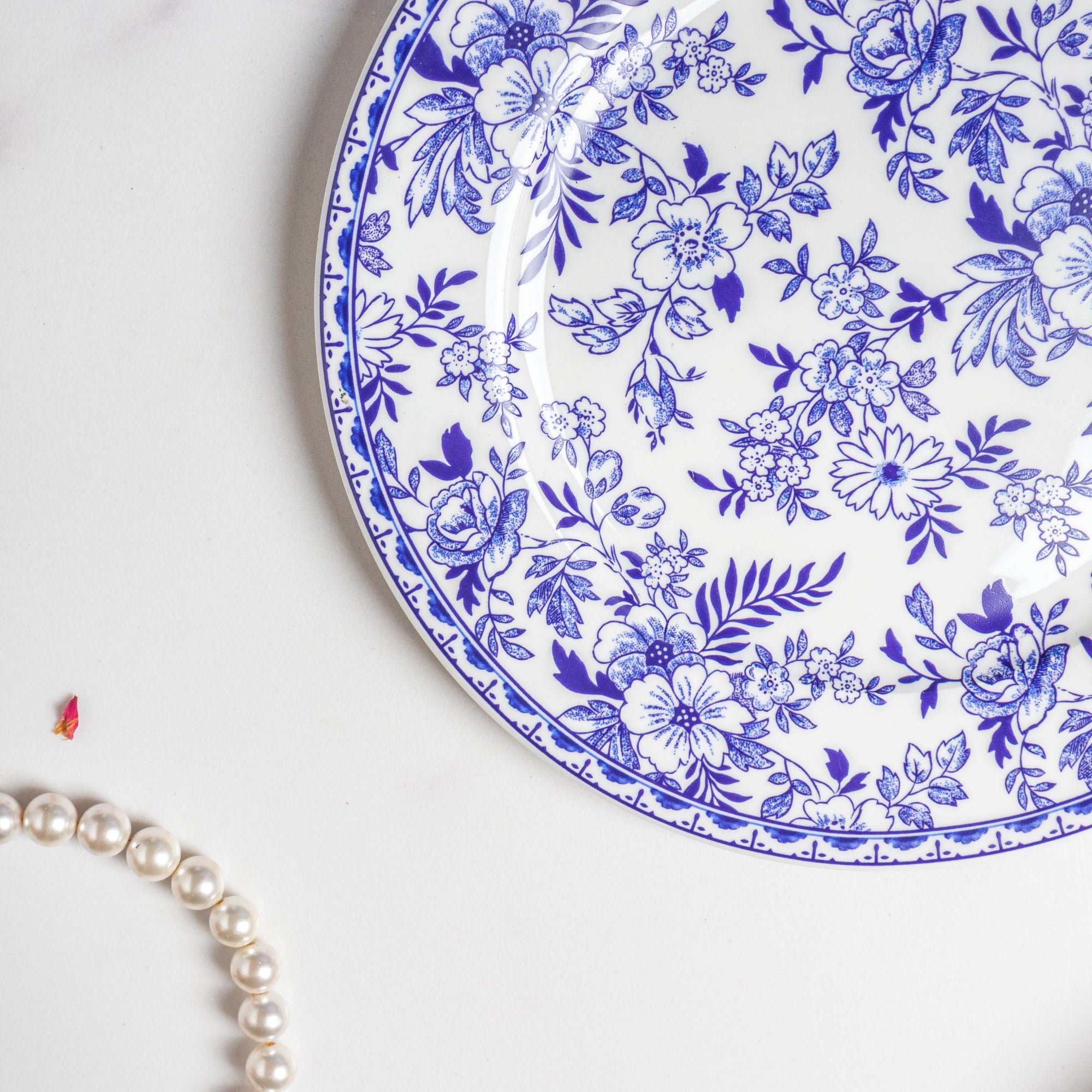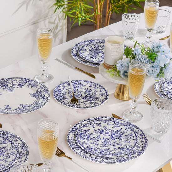 To decorate your dining table using the Riona snack plate start with a clean tablecloth or placemat in a complementary colour, such as white or blue. Place the plate in the centre of each table setting. Add a coordinating cloth napkin on top of the plate or beside it. Accentuate the blue floral motifs by using blue or white dinnerware and glassware. Consider adding fresh flowers or a small centrepiece in matching hues to complete the elegant table setting.