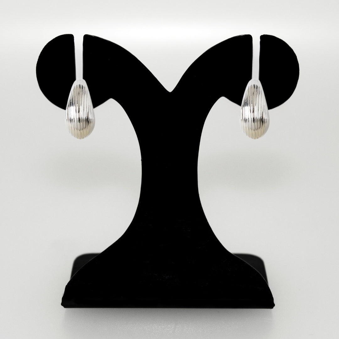 These silver statement earrings boast a sleek, modern design that effortlessly blends sophistication with artistic flair. Shaped like a droplet with a graceful curve, they fit snugly like a huggie, making a bold yet refined statement. The surface of the earrings is beautifully carved with intricate lines, creating a multidimensional effect that catches the light from every angle. Made entirely of silver metal, they exude a polished elegance that elevates any look with their distinctive texture and shape.