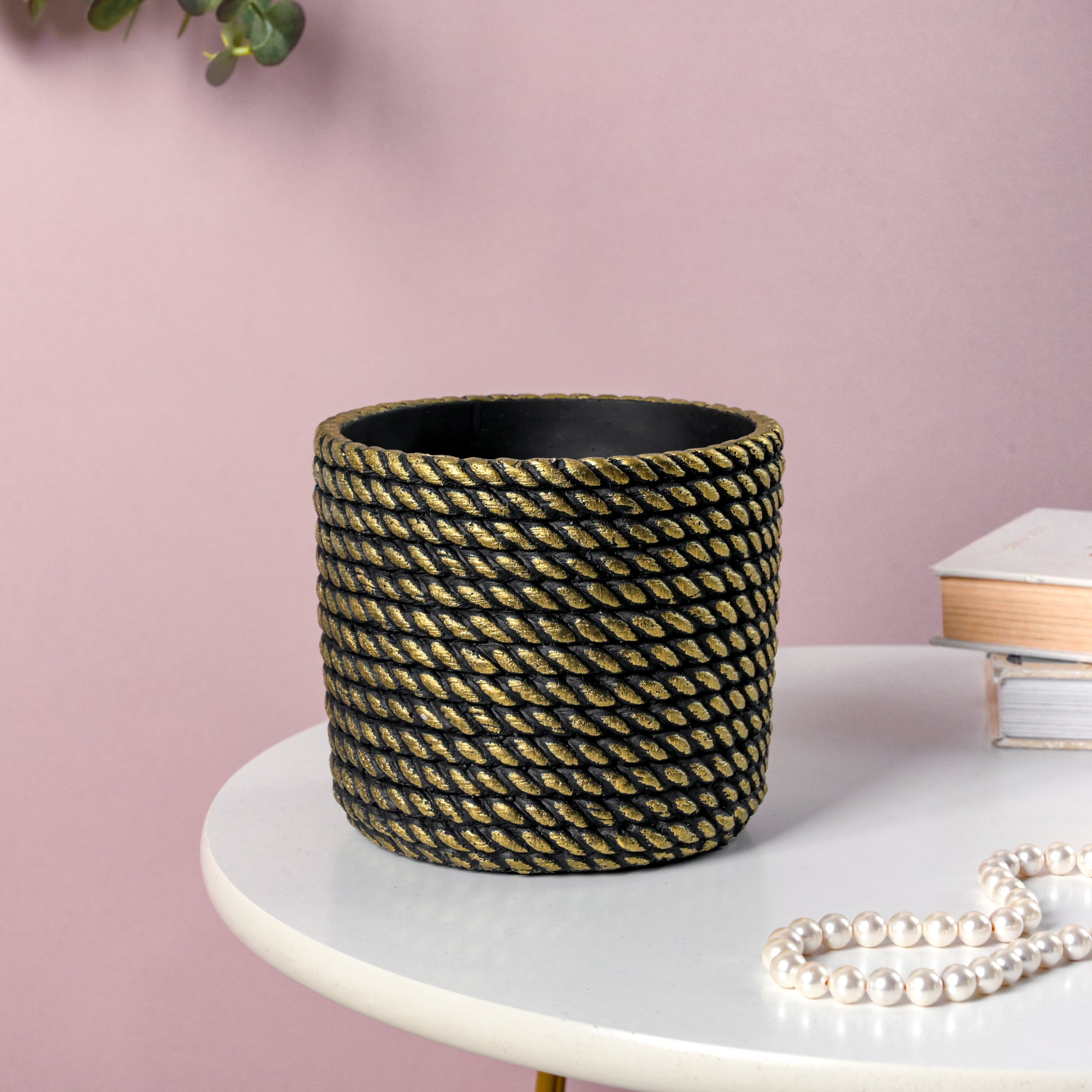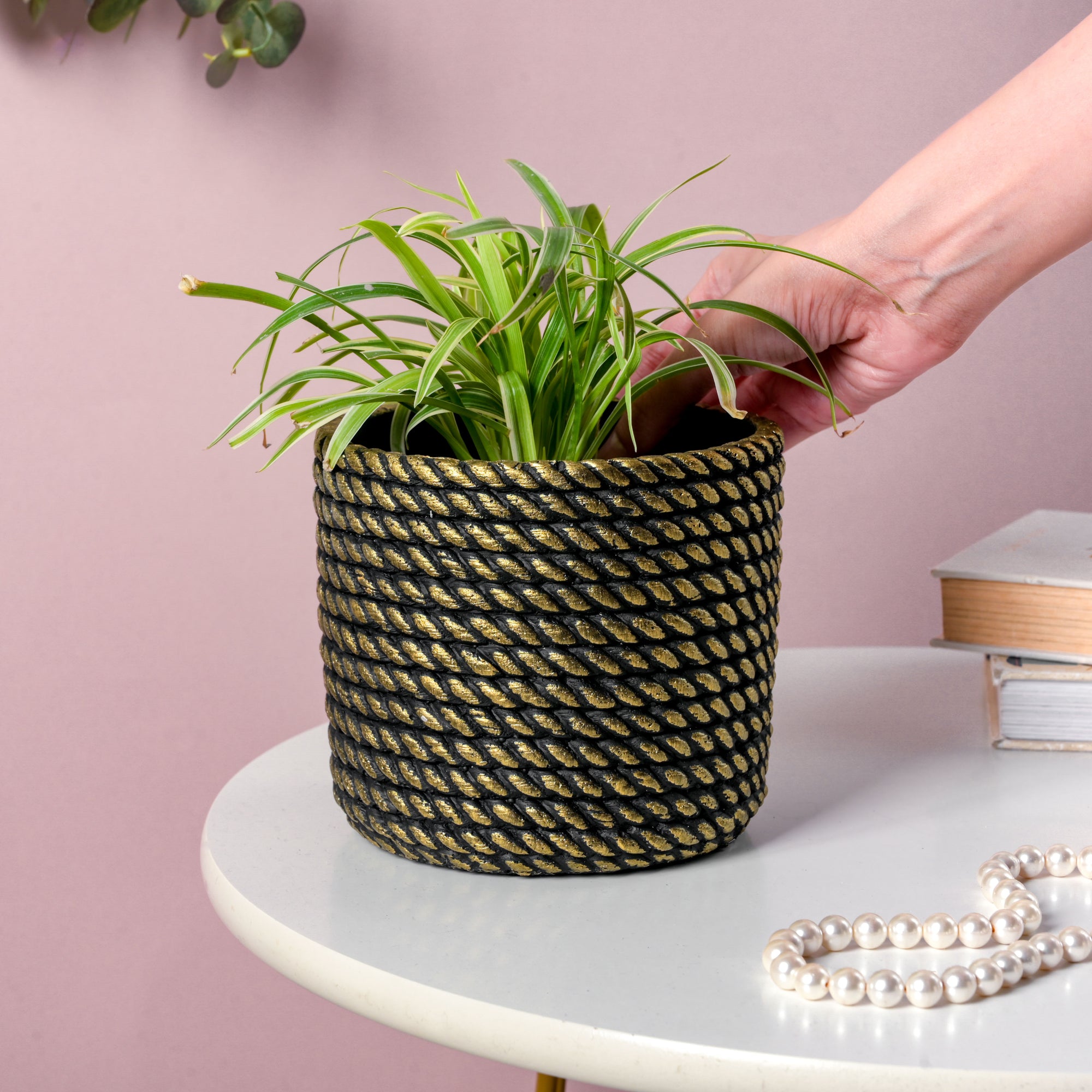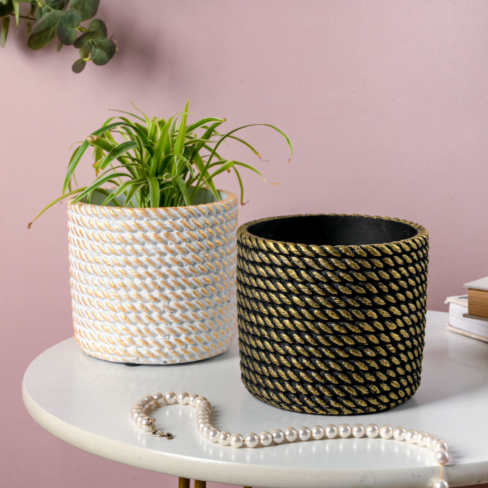 The ceramic flower pot with in black and white comes with golden rope textures which accentuates the rustic finish of the pot. The strong and durable ceramic planter is one-of-a-kind and exudes sophistication. Combine the two planters to create a rustic and earthy look in the urban home. The rustic planter has a hole at the bottom for draining excess water from the soil.