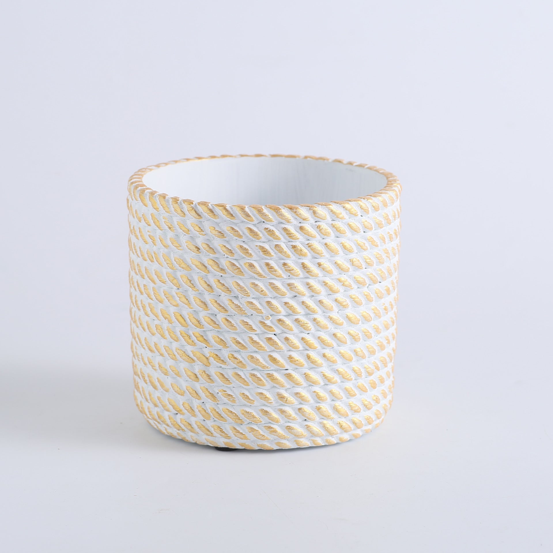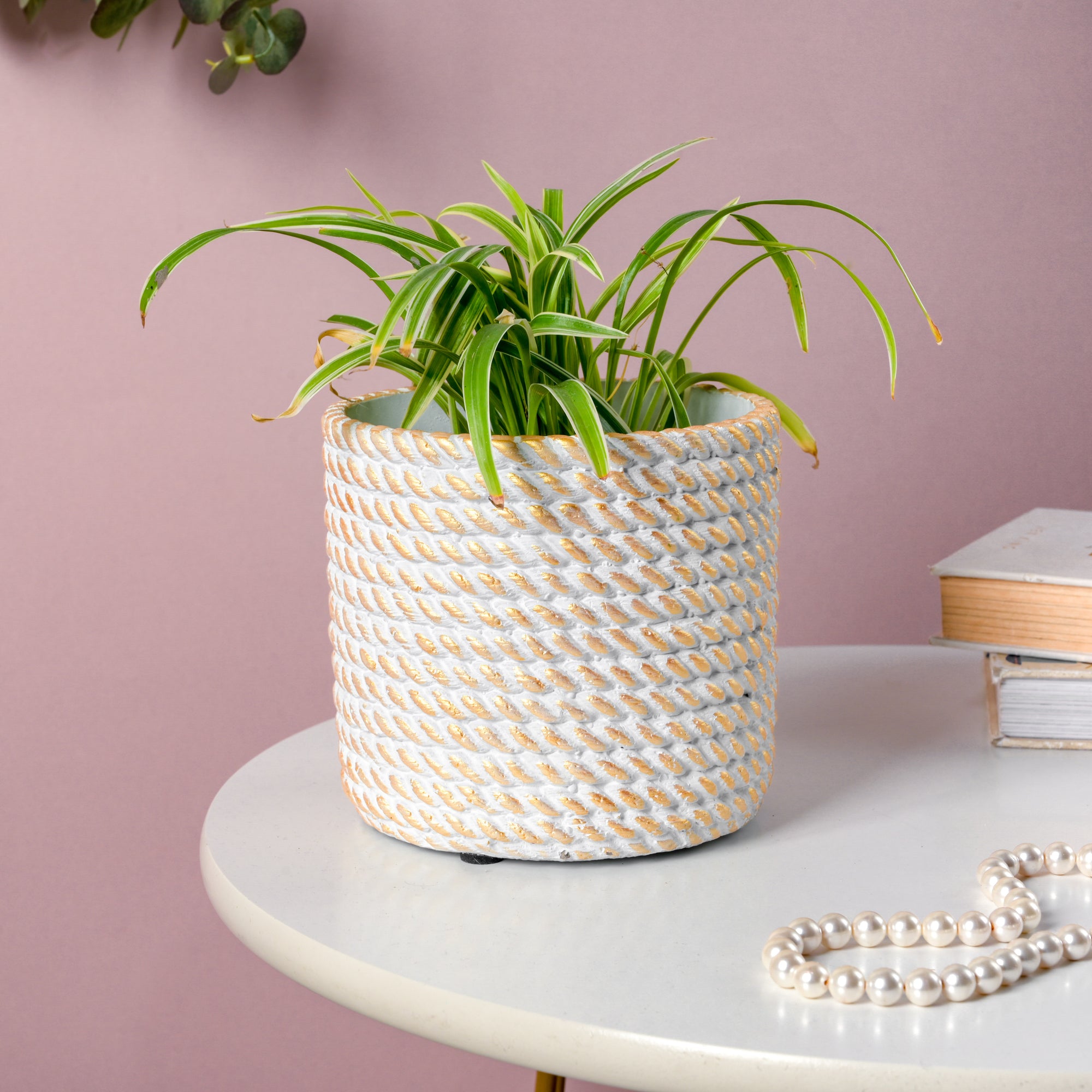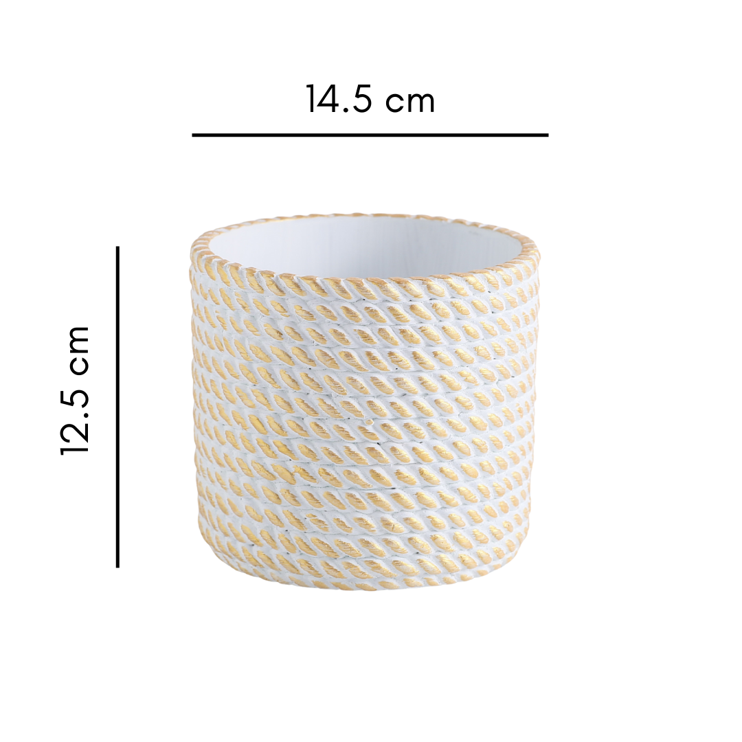 The ceramic flower pot with in black and white comes with golden rope textures which accentuates the rustic finish of the pot. The strong and durable ceramic planter is one-of-a-kind and exudes sophistication. Combine the two planters to create a rustic and earthy look in the urban home. The rustic planter has a hole at the bottom for draining excess water from the soil.
