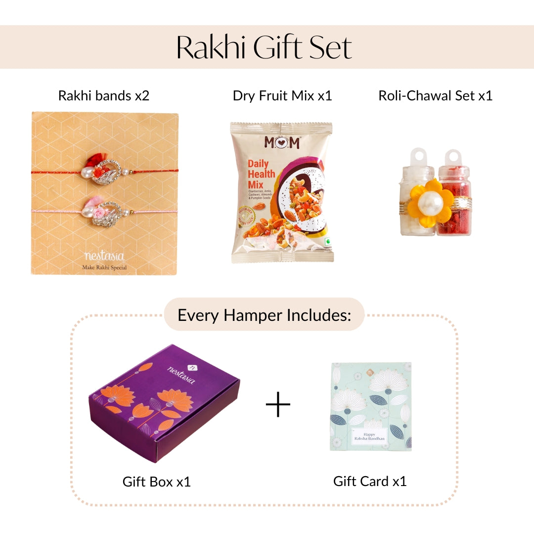 The set includes 2 Rakhi bands, 1 roli chawal bottle set, 1 pack of mixed dry fruits (free gift), 1 gift box, and 1 wish card.