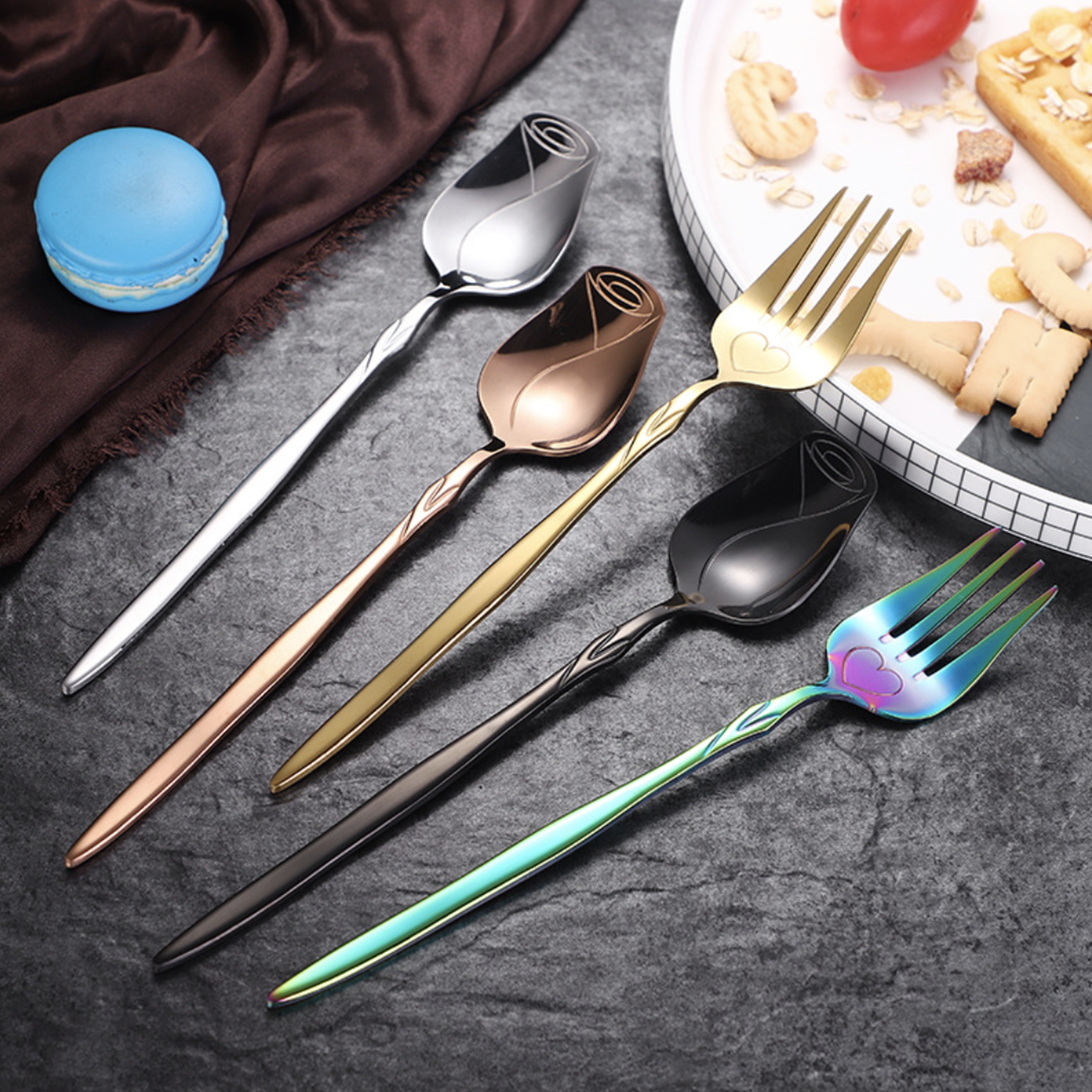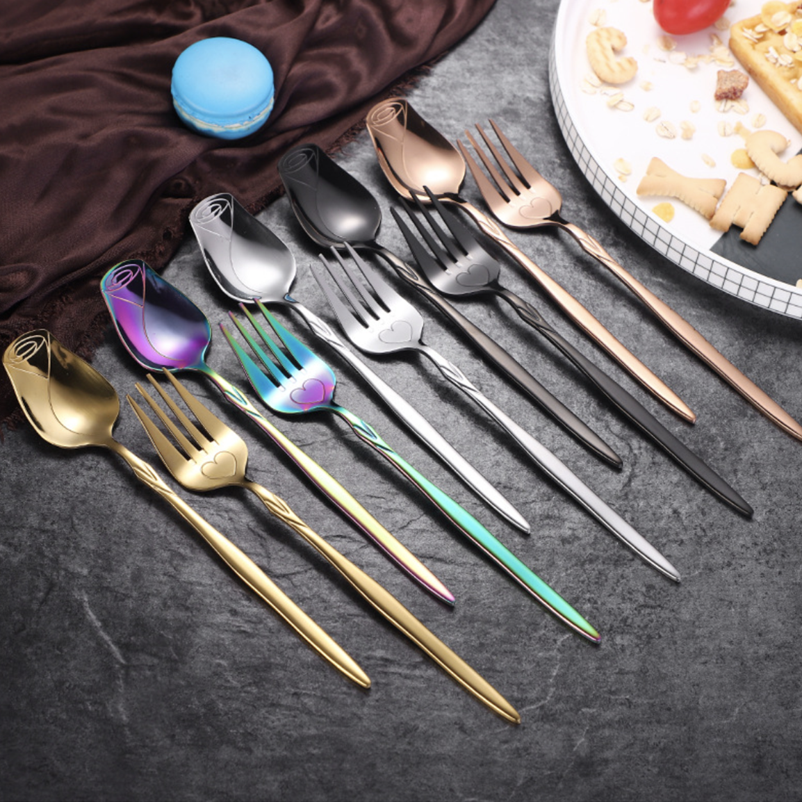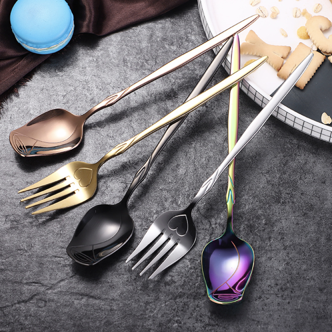 Colorful metal cutlery in a rose theme. The bowl of the spoons is shaped like a rose and the handle of the spoons are shaped like a rose stem. Dinner forks which match very well with the spoons and are comfortable to grip due to their tapered handles, which provide the appropriate balance. They are made of stainless steel and look great during a dinner party. The forks and spoons are also durable enough to use every day. They are manufactured of high-quality 304 stainless steel with a finely polished surface to prevent corrosion and overheating and are extremely durable and easy to use. Whether eating noodles, rice, sushi, or a bento box, the fork provides a more pleasant experience and is designed to improve dexterity. The spoons and forks come in a wide variety of colors and are available in a set of 4 of the same color.