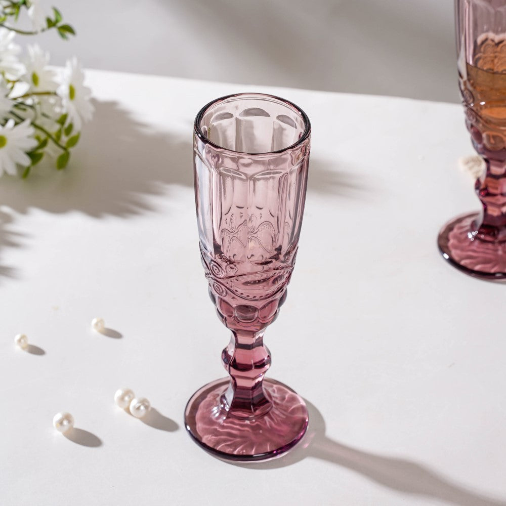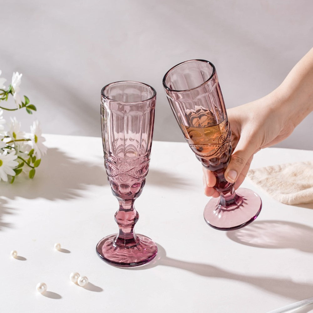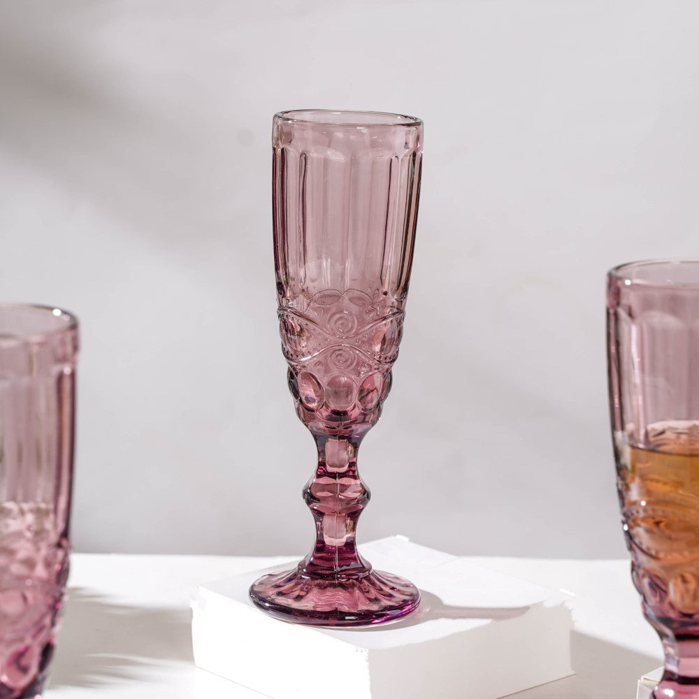 Our exquisite set of 6 stemmed champagne glasses is perfect for elevating your celebration to new heights. Crafted with precision and elegance, each glass boasts a stunning mauve colour, adding a touch of sophistication to your table setting. The textured exterior adds a unique and tactile dimension, ensuring a memorable sensory experience with every sip. Made from high-quality and food-safe glass, these champagne flutes are not only visually stunning but also durable, ensuring long-lasting enjoyment for all your special occasions. Whether it's a wedding reception, anniversary, or any joyous event, these glasses will be the epitome of refined taste and refined design. Toast in style with our impeccable stemmed champagne glasses.
