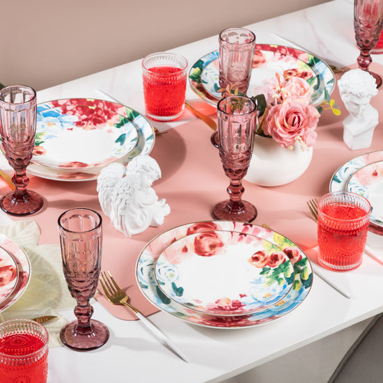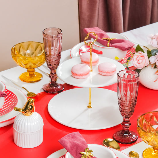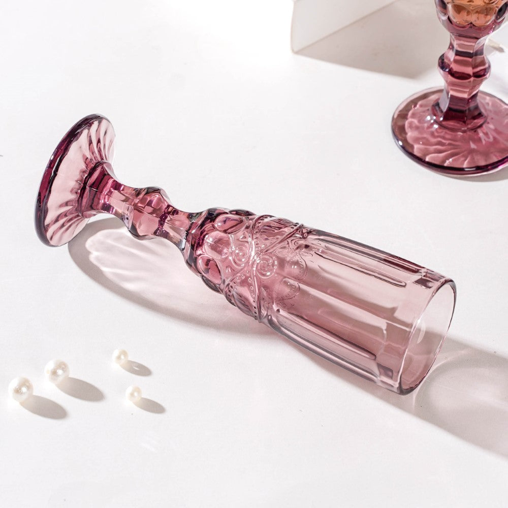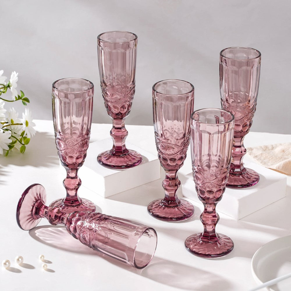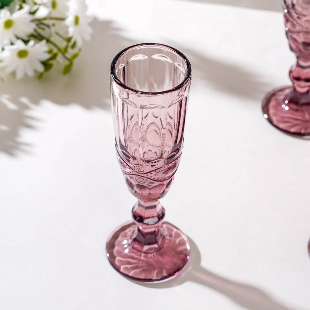 Our exquisite set of 6 stemmed champagne glasses is perfect for elevating your celebration to new heights. Crafted with precision and elegance, each glass boasts a stunning mauve colour, adding a touch of sophistication to your table setting. The textured exterior adds a unique and tactile dimension, ensuring a memorable sensory experience with every sip. Made from high-quality and food-safe glass, these champagne flutes are not only visually stunning but also durable, ensuring long-lasting enjoyment for all your special occasions. Whether it's a wedding reception, anniversary, or any joyous event, these glasses will be the epitome of refined taste and refined design. Toast in style with our impeccable stemmed champagne glasses.