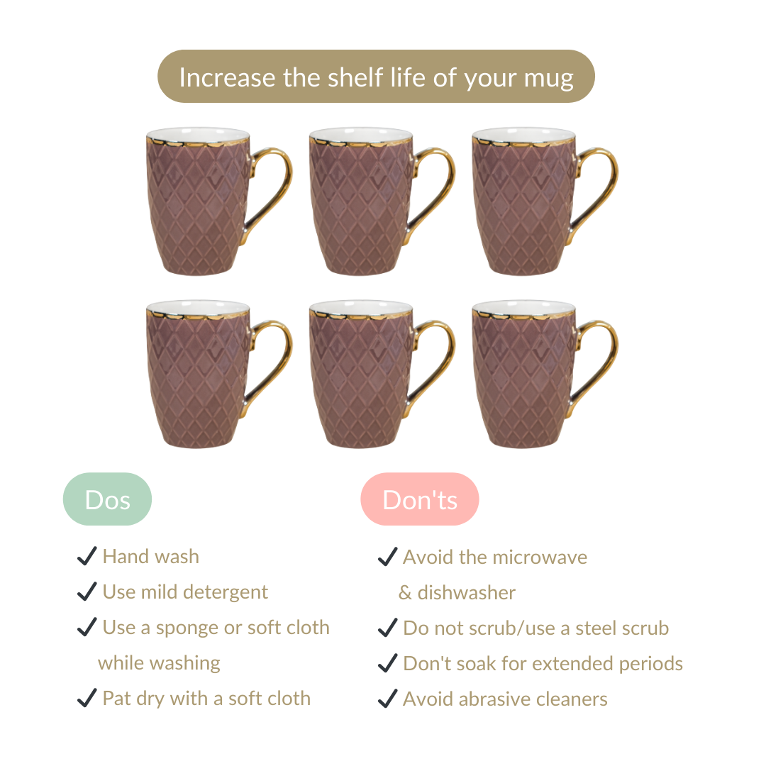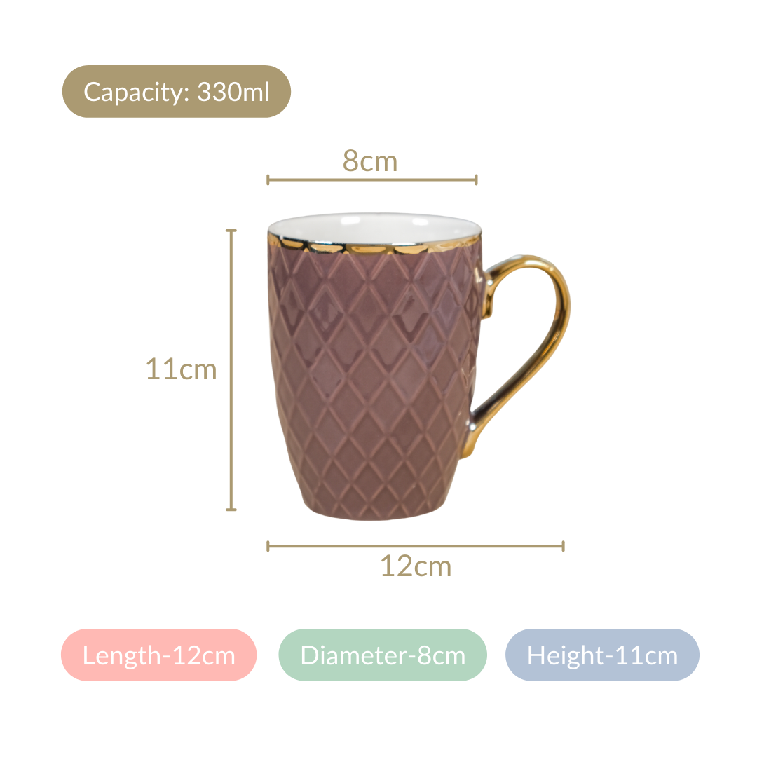 Elevate your beverage rituals to a whole new level of sophistication with our ceramic cup set. This coffee mug collection comprises six elegant mugs, each graced with a rich and deep brown hue. The exterior of these ceramic teacups is adorned with intricate diamond-textured patterns, adding an extra layer of grace to your drinking experience. Crafted from premium quality non-porous ceramic material, the mugs boast a radiant golden rim and a sturdy golden C-shaped handle, ensuring a comfortable and luxurious grip. They are perfectly designed to serve your favourite beverages in style.