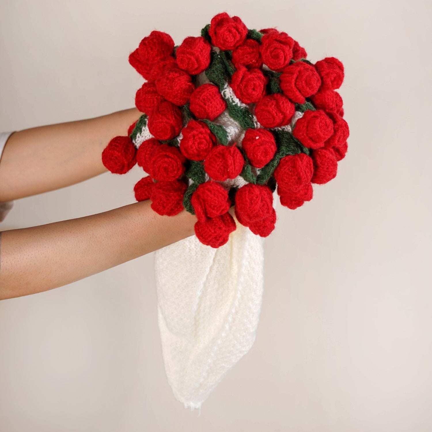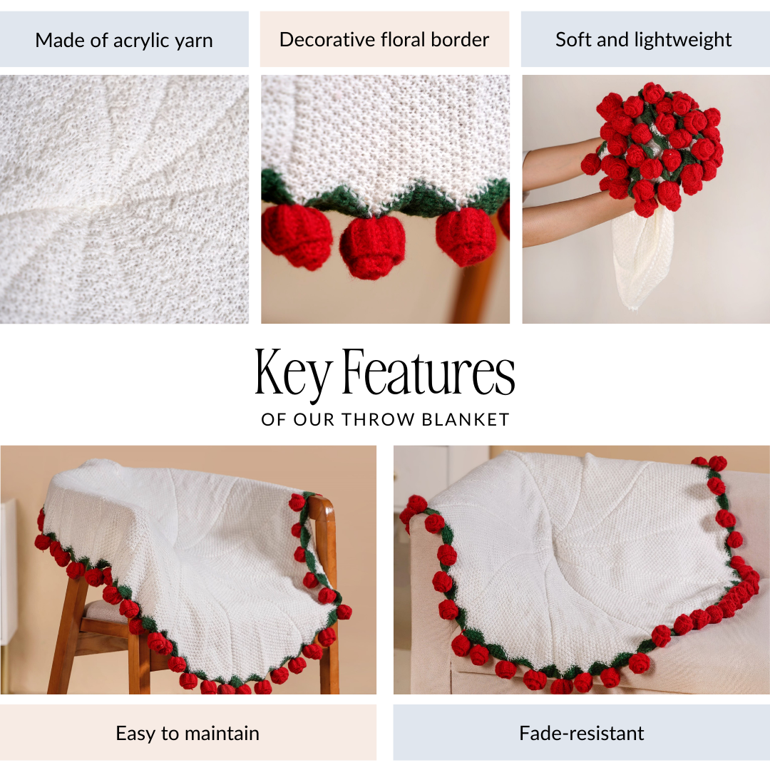 Design: Designed to resemble an enchanted garden, this acrylic yarn bouquet blanket features a soft, circular knit in pristine white. A leafy green scalloped border winds around the edges, while crocheted vibrant red roses bloom playfully along the rim, creating a dreamy, storybook-worthy look.
