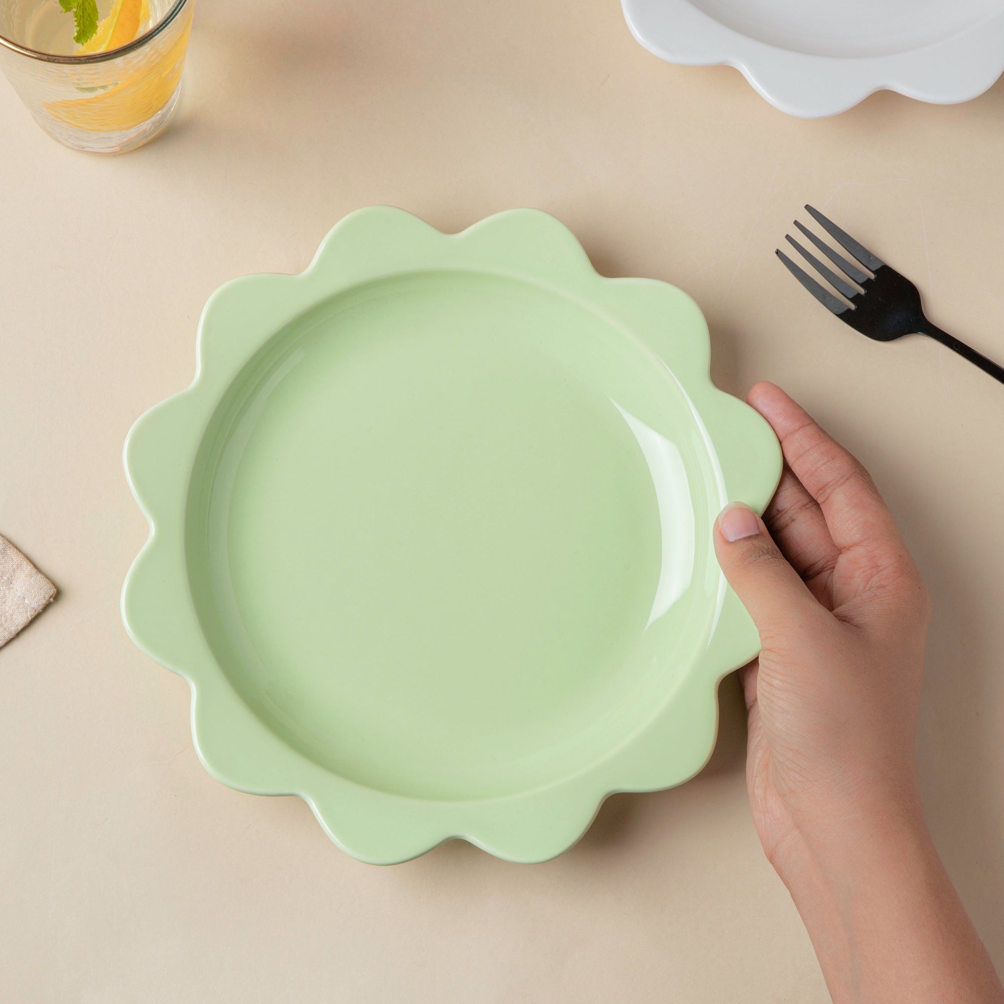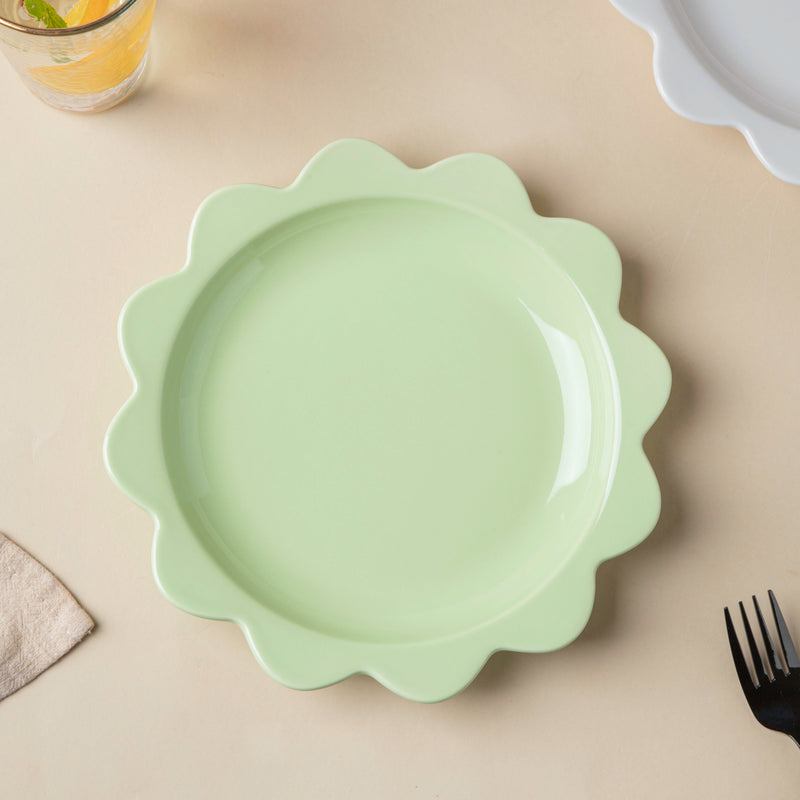 With the ever-beautiful ceramic snack plate, it's time to bring a touch of sweetness to the table. The design of the ceramicware is breath-taking with a pastel green hue and a flower-shaped rim, a blend of minimalist and contemporary design. The plate may also be used as a breakfast plate and a pasta plate.