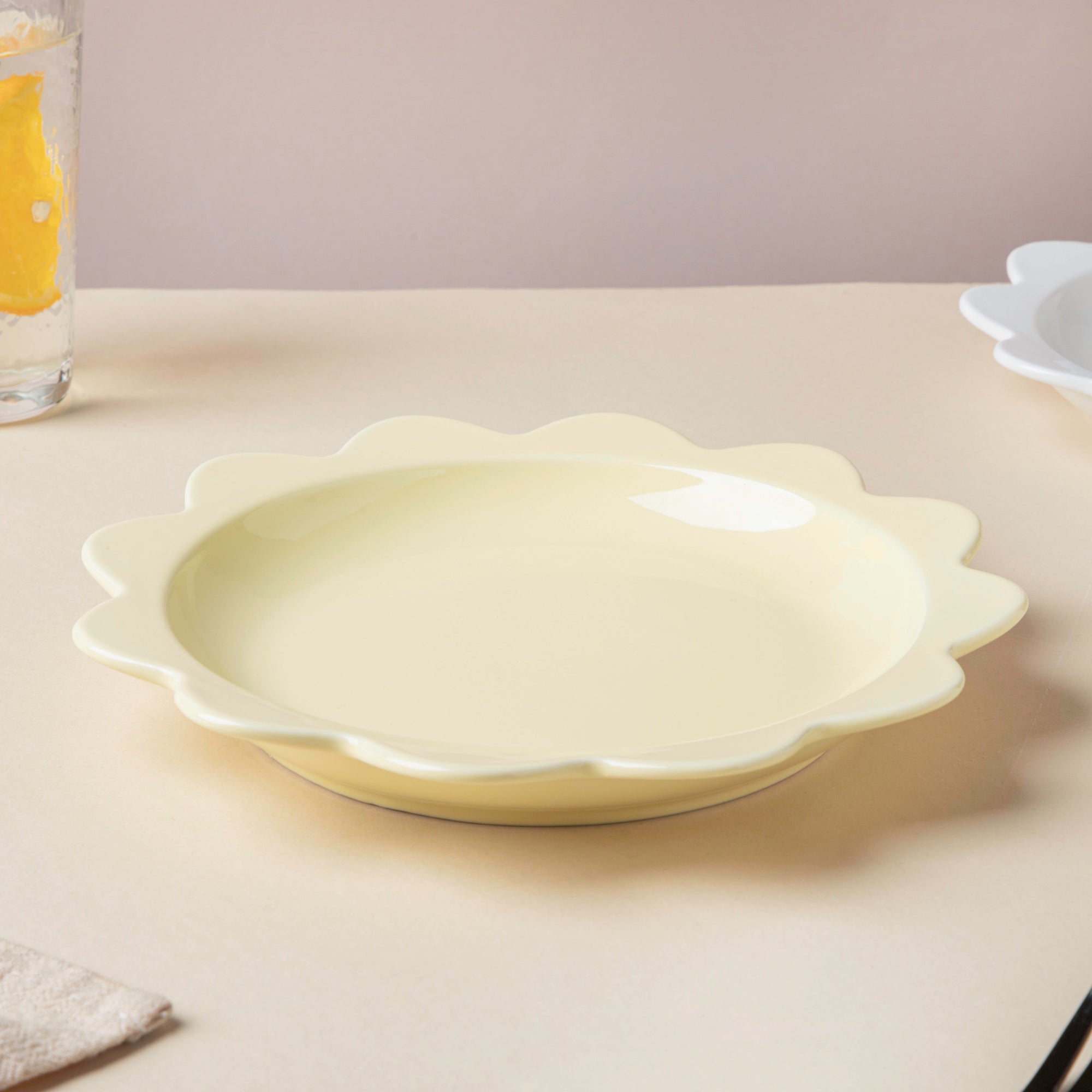 A delicious side dish necessitates an equally modish side plate to serve it on. That's exactly what the floral ceramic pasta plate is for. A flowery reiteration in a faint yellow tint lends a folklore sense to the design. The elegantly shaped plate may be used to present spaghetti and pasta or can be used even as a snack plate.