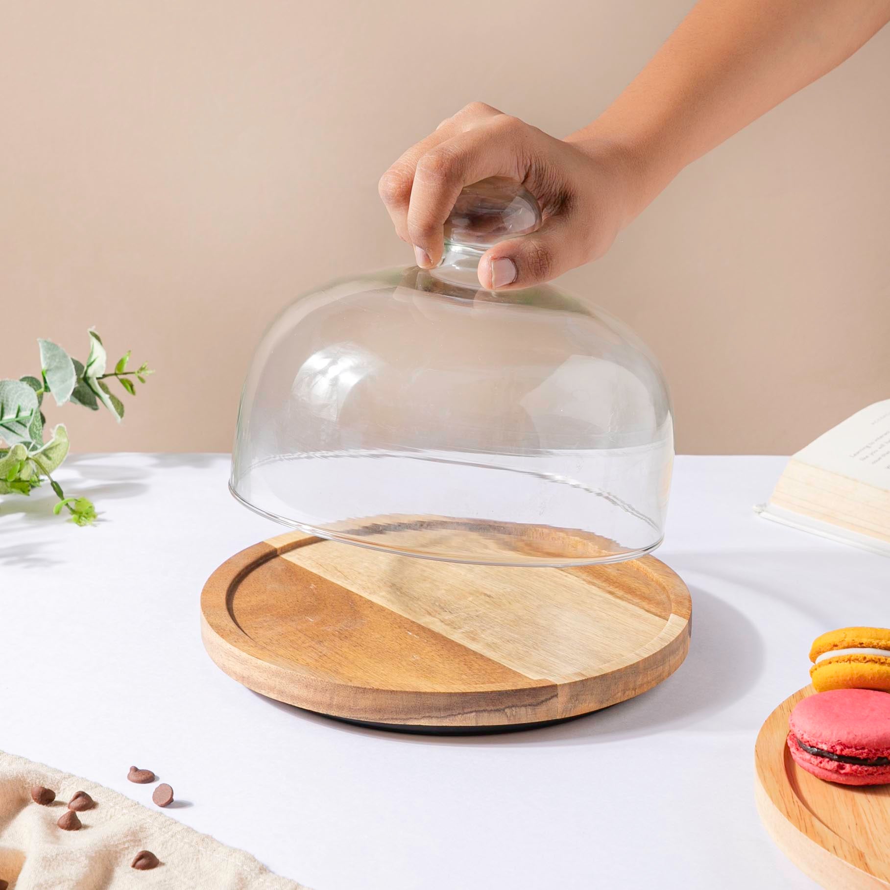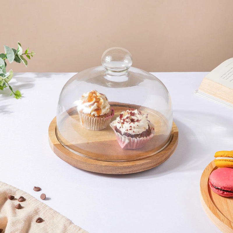 The rotating cake stand comes with a wooden plate and a glass cloche. The wooden cake stand has a metallic plate under the wooden plate to give the cake stand with dome a special rotating characteristic. The cake stand with a cake plate and glass cloche can enhance the dining experience and can be used as a cupcake stand or to keep savories away from the flies and also keep them fresh for a long time. Two different varieties of wood have been used to make the cake plates which can also be used as a birthday cake stand or a cake decorating stand.