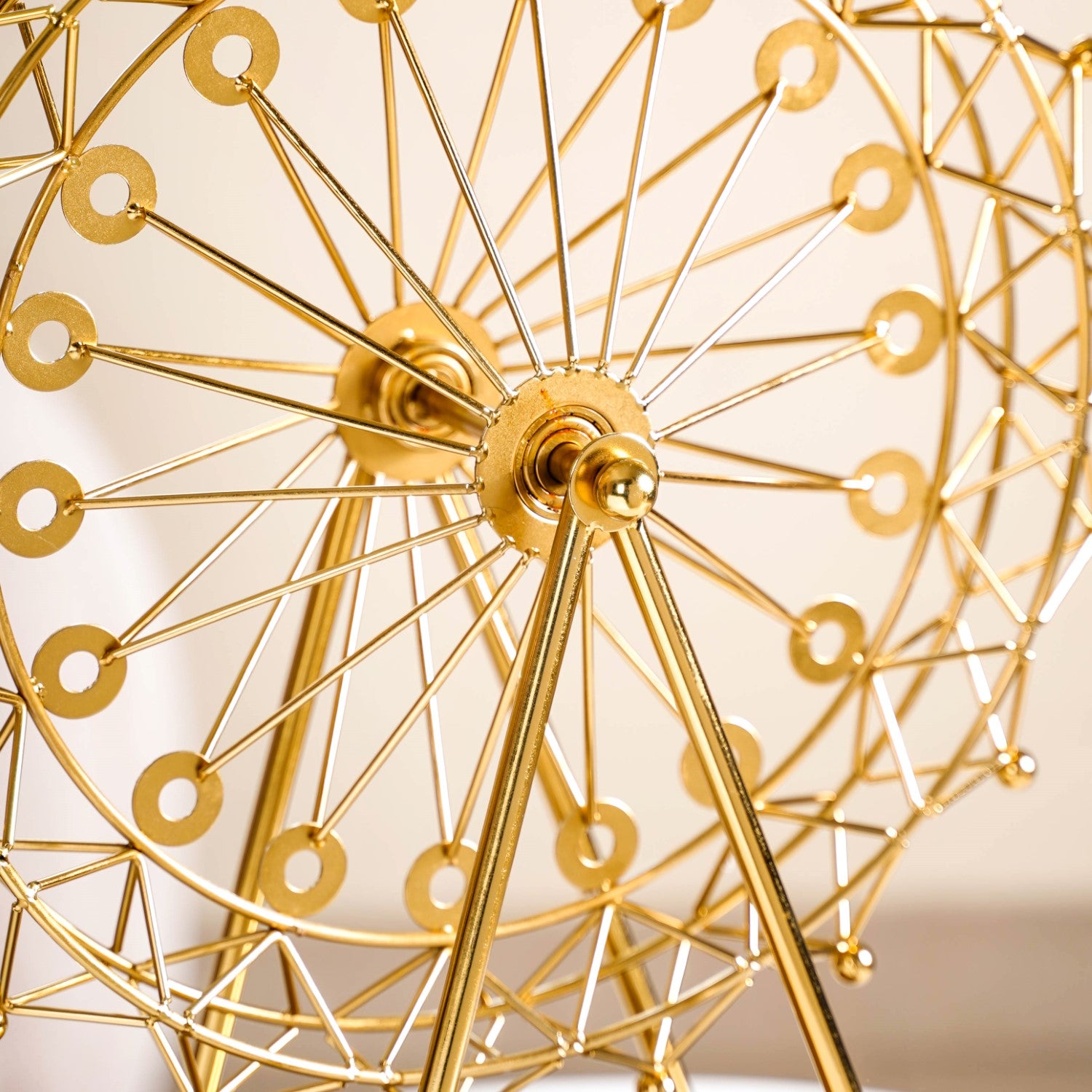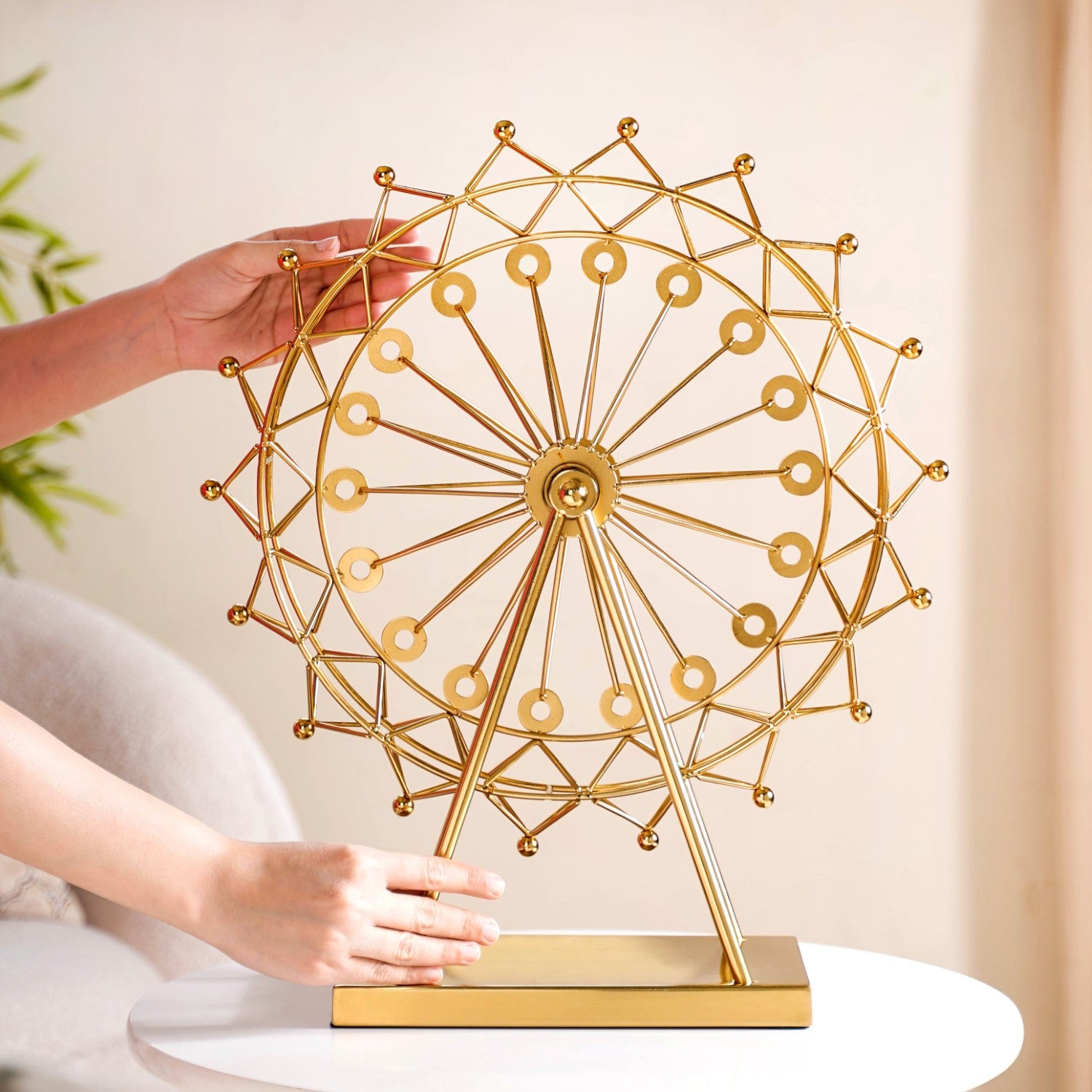 Design: This Ferris wheel showpiece features an intricately detailed vintage design that brings the magic of old-time amusement parks into your home. The rotating Ferris wheel is adorned with a high-sheen metallic gold finish, adding a sophisticated and eye-catching element. The ornate craftsmanship includes delicate spokes, creating a visually stunning centrepiece that embodies both whimsy and refinement.