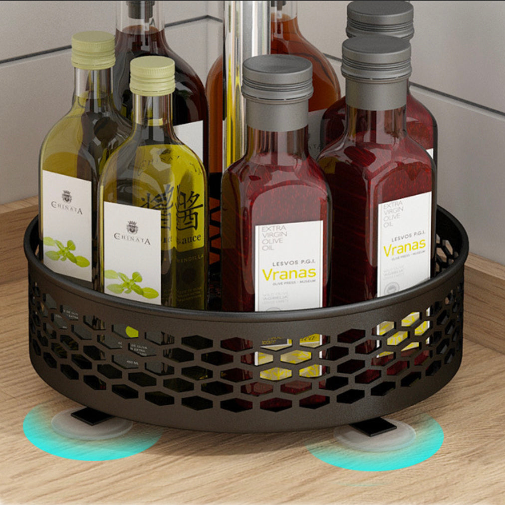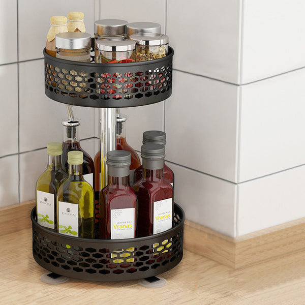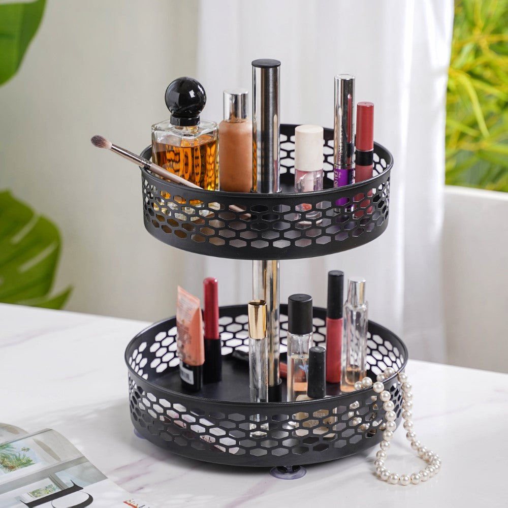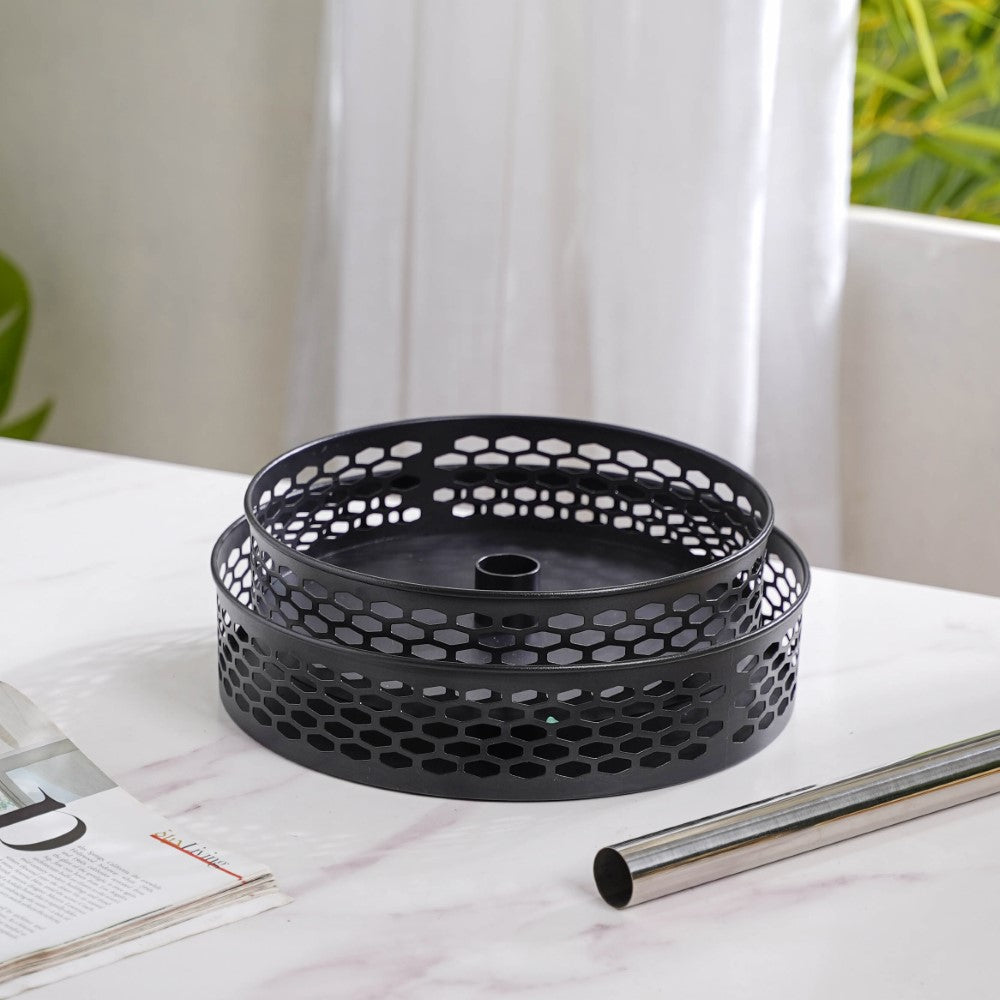 Keep the kitchen counters and bathroom slabs organized with the black perforated double decker rotating storage rack. The black two-tier rotating tray comes with three suction cups on the base to hold on to the table/floor where it is kept. One can store the rack after disassembling the parts when not in use. Features:-stable and skid proof strong base-smooth rotating base for easy access of products -two tier storage rack with handle -suitable for the bathroom, kitchen, dresser, or garden-can be used for vegetables, vanity, bath products and fruits -removable shelves for hassle-free cleaning -perforated racks for easy drainage -racks can be disassembled for storage when not in use-durable and space-saving -easy and effortless to assemble -innovative design Nestip: Store oil bottles or containers in the rack to keep the kitchen space neat and clean. Size: Full height- 39cm Large basket- 26cm D x 6cm H Small basket- 23cm D x 6cm H Color: Black Material: PVC and metal Products included: 1 set of 2 storage racks Style: OMG114KU06