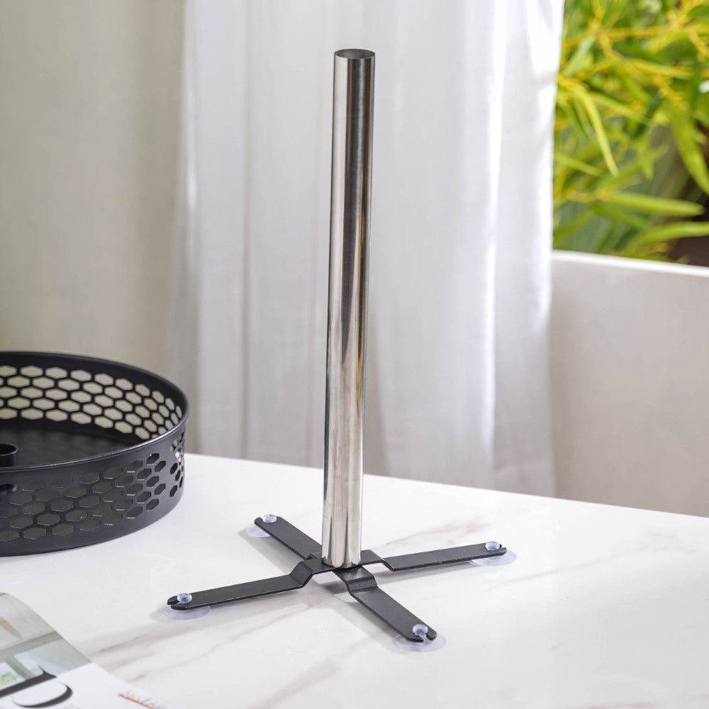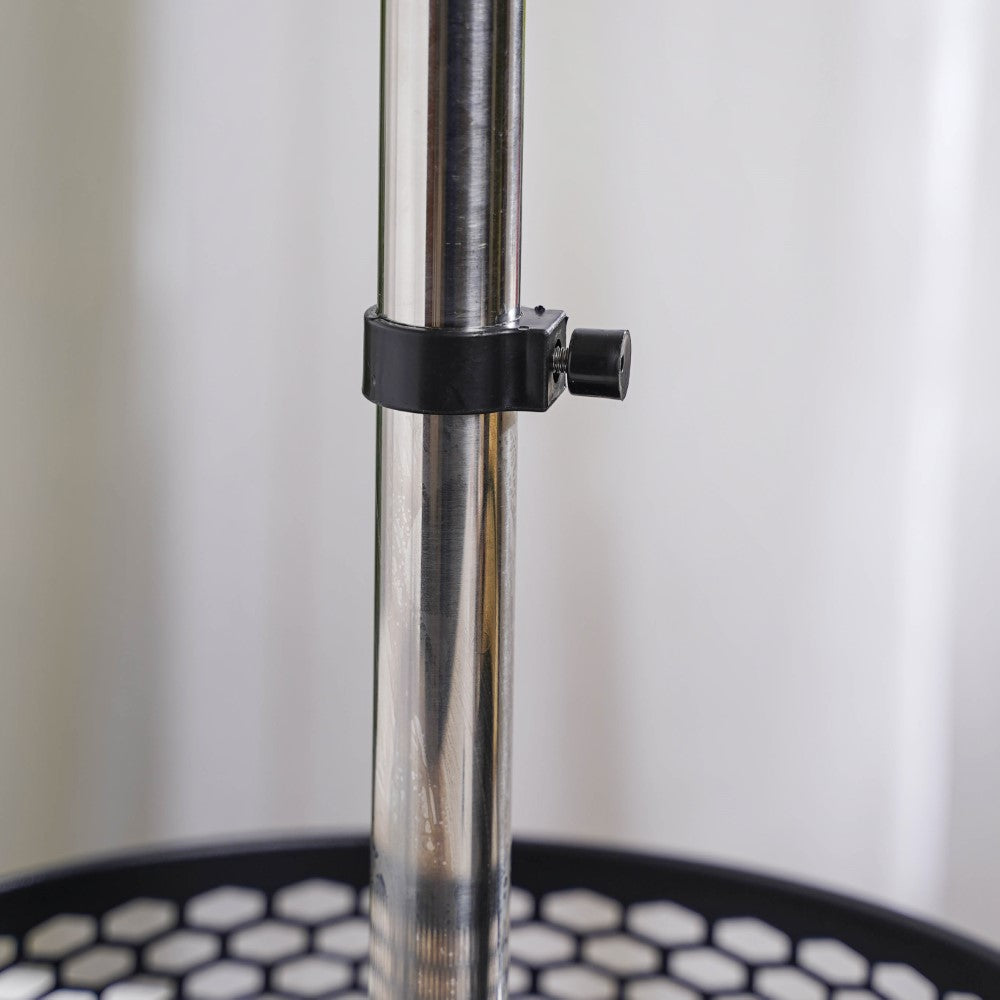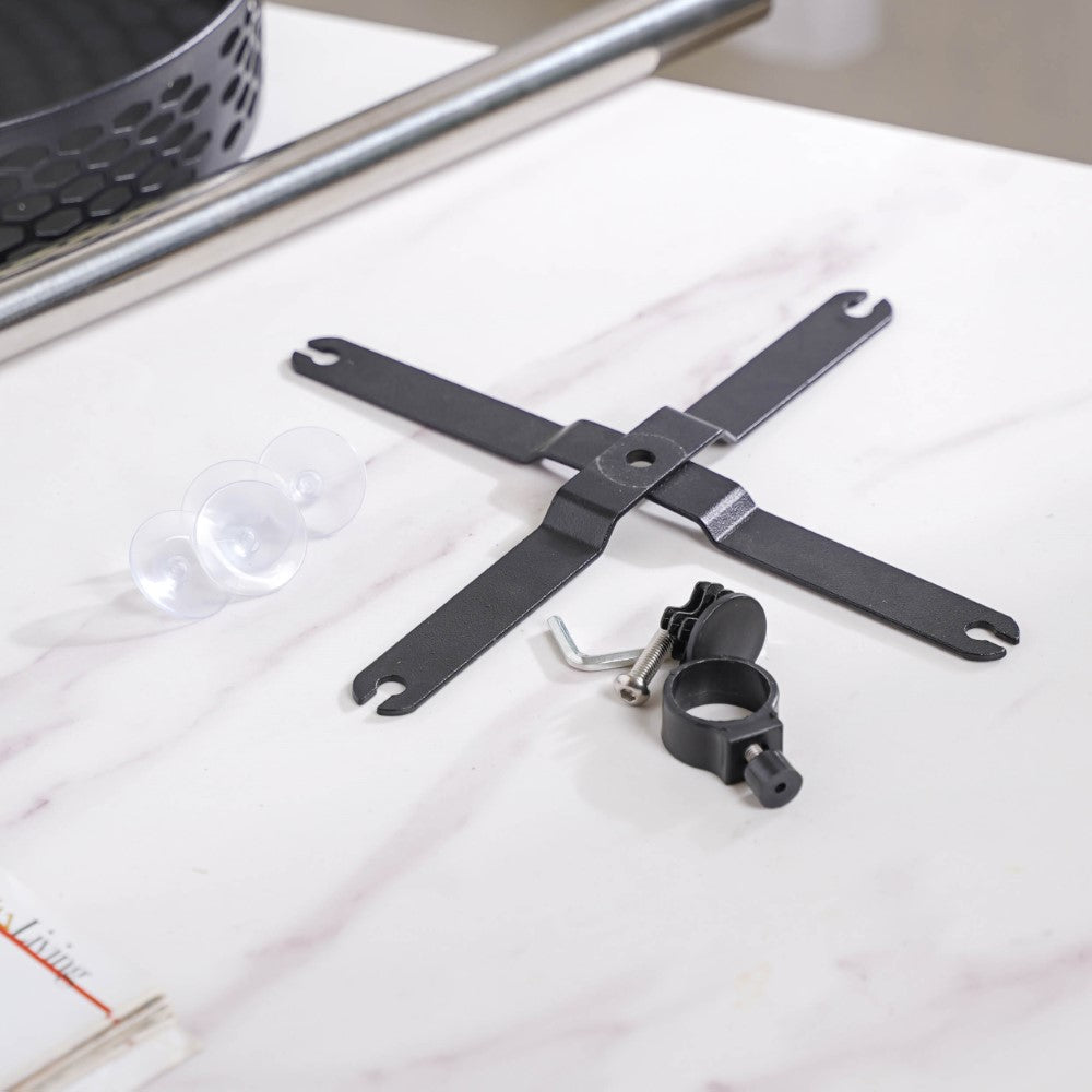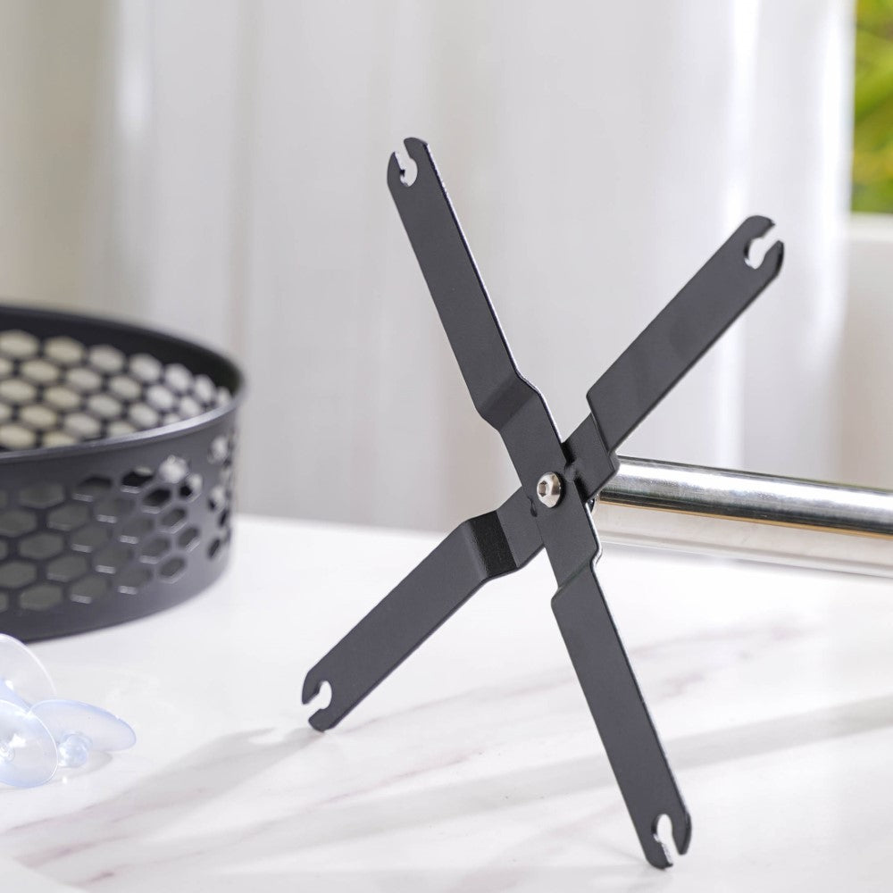 Keep the kitchen counters and bathroom slabs organized with the black perforated double decker rotating storage rack. The black two-tier rotating tray comes with three suction cups on the base to hold on to the table/floor where it is kept. One can store the rack after disassembling the parts when not in use. Features:-stable and skid proof strong base-smooth rotating base for easy access of products -two tier storage rack with handle -suitable for the bathroom, kitchen, dresser, or garden-can be used for vegetables, vanity, bath products and fruits -removable shelves for hassle-free cleaning -perforated racks for easy drainage -racks can be disassembled for storage when not in use-durable and space-saving -easy and effortless to assemble -innovative design Nestip: Store oil bottles or containers in the rack to keep the kitchen space neat and clean. Size: Full height- 39cm Large basket- 26cm D x 6cm H Small basket- 23cm D x 6cm H Color: Black Material: PVC and metal Products included: 1 set of 2 storage racks Style: OMG114KU06