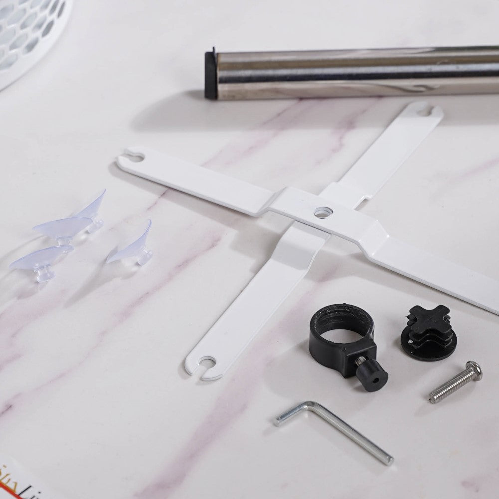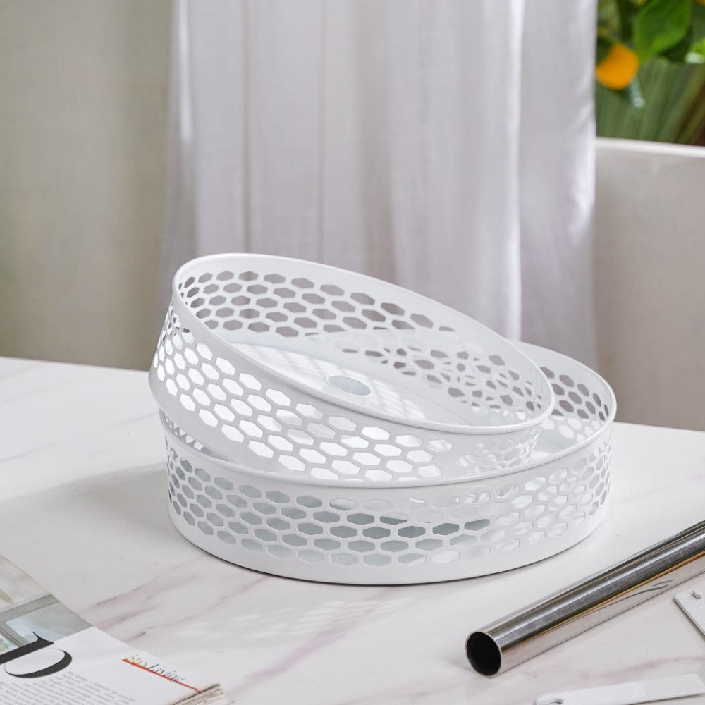 The two-tier organizer with perforated racks lends a classy vibe to the modern interior. The rotating tray is extremely easy to clean. Simply wipe off the surface with a wet cloth to preserve the extra clean look. The stands are constructed of durable PVC which is extremely sturdy and will not bend or break with regular use. Features:-stable and skid proof strong base-smooth rotating base for easy access of products-two tier storage rack with handle-suitable for the bathroom, kitchen, dresser, or garden-can be used for vegetables, vanity, bath products and fruits-removable shelves for hassle-free cleaning-perforated racks for easy drainage-racks can be disassembled for storage when not in use-durable and space-saving-easy and effortless to assemble-innovative design Nestip: When not in use, the rack can be disassembled and stored in a closet. Size: Full height- 39cm Large basket- 26cm D x 6cm H Small basket- 23cm D x 6cm H Color: White Material: PVC and metal Products included: 1 set of 2 storage racks Style: OMG114KU07