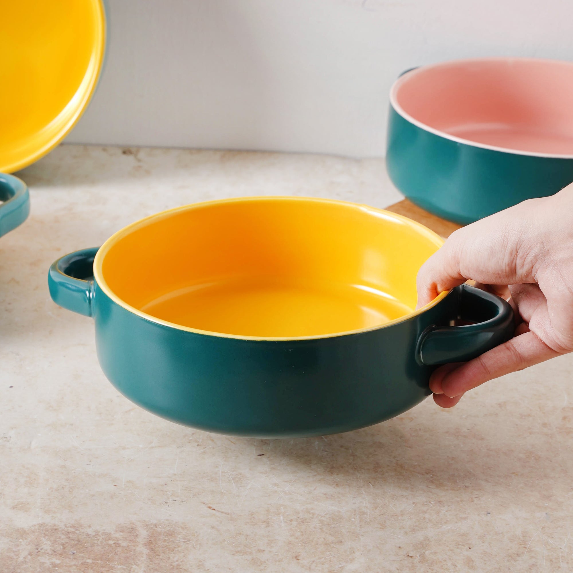 Shubhra The glazed emerald green and pink make a stunning combo. The craftsmanship is excellent as always. I like the size too - perfect for 2-3 pax meal. Adds glam to our dinning table.