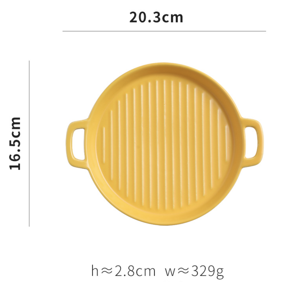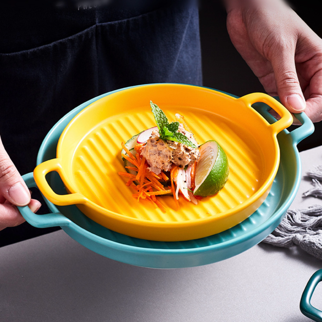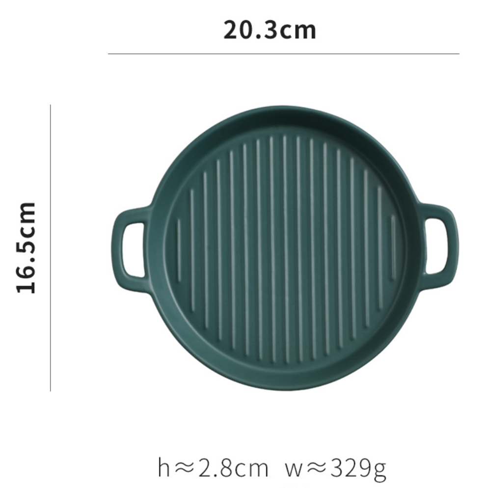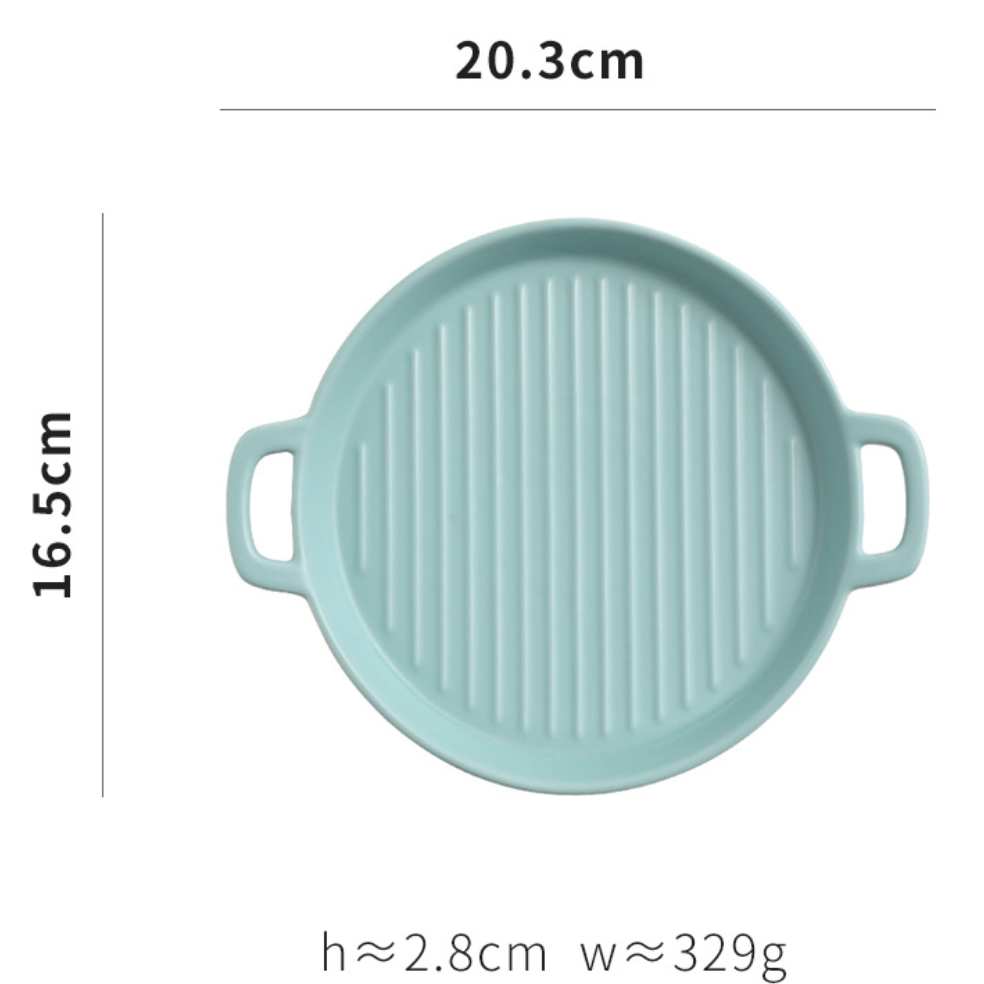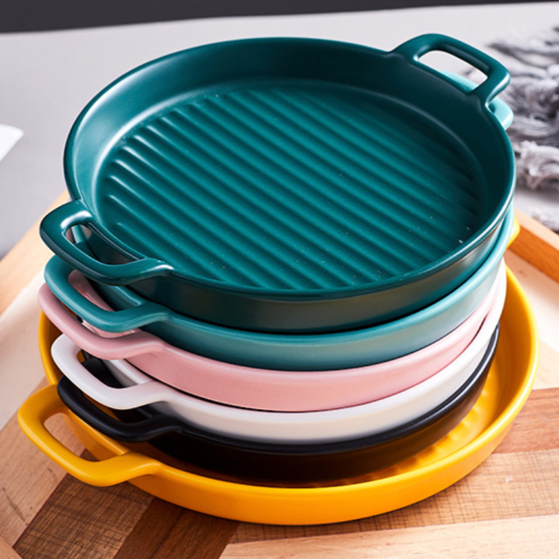 Round baking trays that have two handles, made of ceramic, can be used for baking and grilling. Bake veggies, and baked dishes in the baking plate that come in 3 colour variants available in 2 sizes and serve it directly on the party table. The plates are microwave, oven and dishwasher friendly and can be used as a tart dish for baking tarts, pies, skillet cookies and desserts.