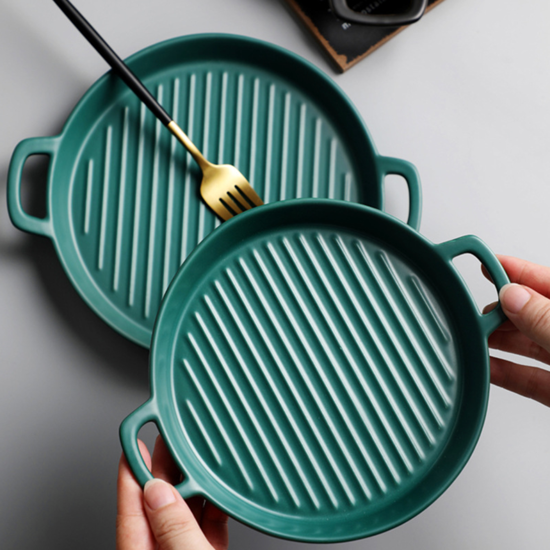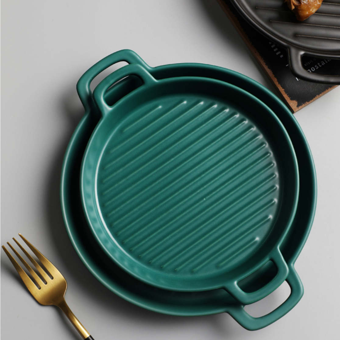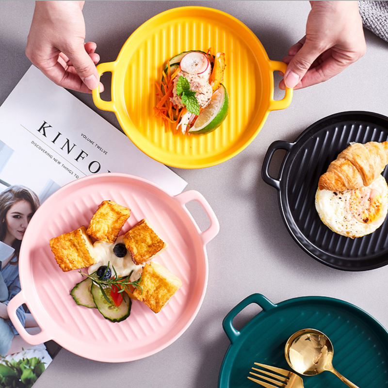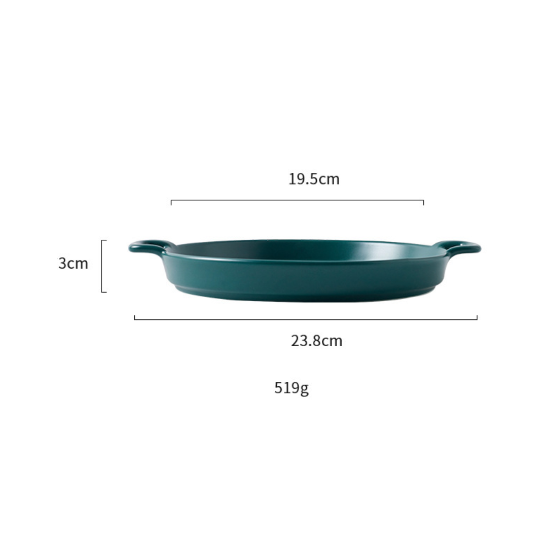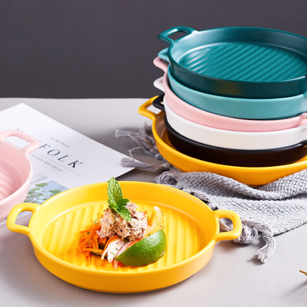 Round baking trays that have two handles, made of ceramic, can be used for baking and grilling. Bake veggies, and baked dishes in the baking plate that come in 3 colour variants available in 2 sizes and serve it directly on the party table. The plates are microwave, oven and dishwasher friendly and can be used as a tart dish for baking tarts, pies, skillet cookies and desserts.