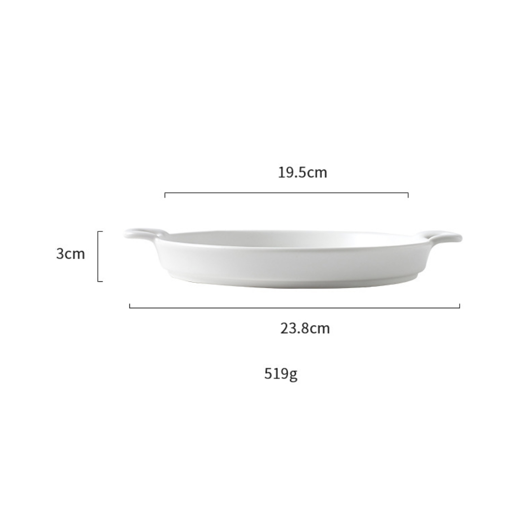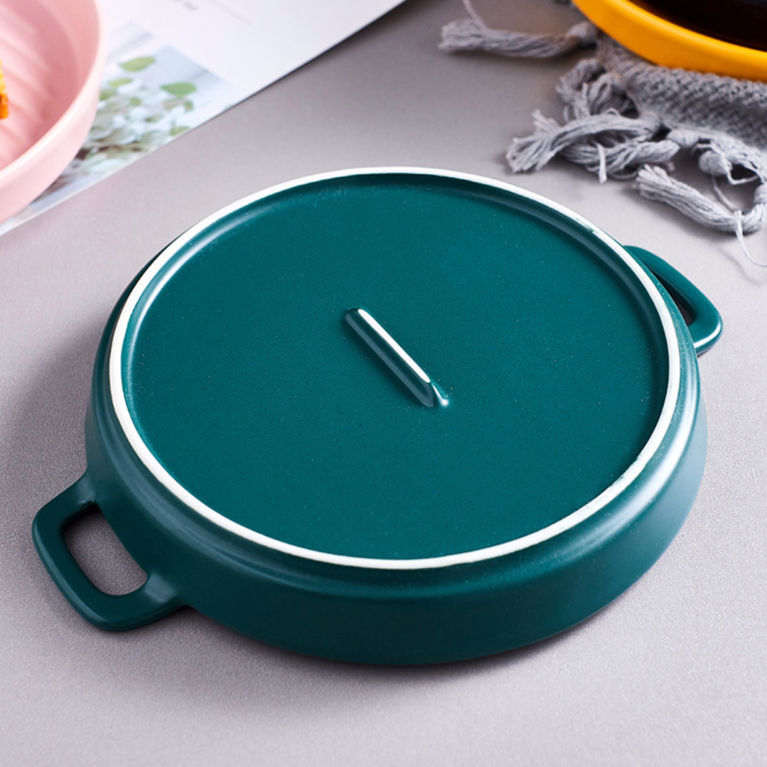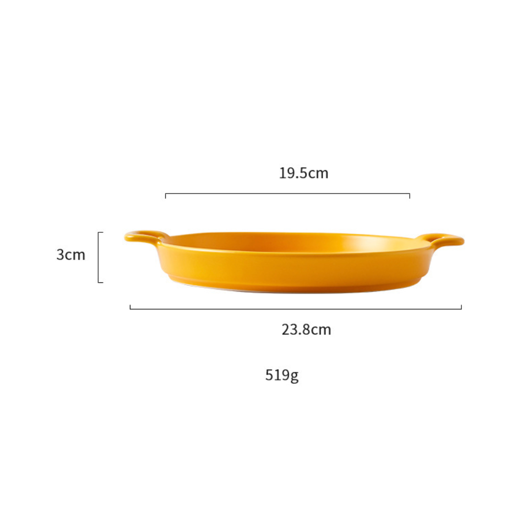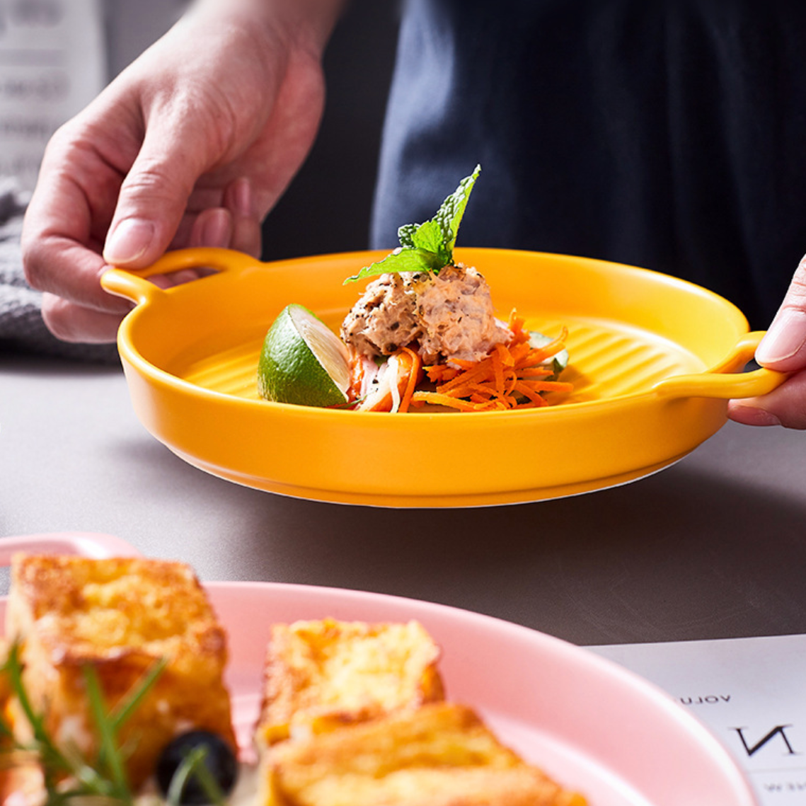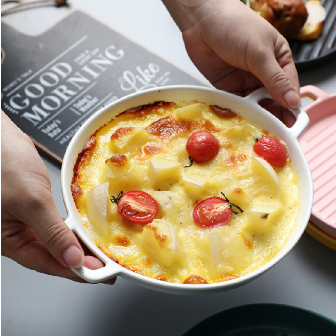 Round baking trays that have two handles, made of ceramic, can be used for baking and grilling. Bake veggies, and baked dishes in the baking plate that come in 3 colour variants available in 2 sizes and serve it directly on the party table. The plates are microwave, oven and dishwasher friendly and can be used as a tart dish for baking tarts, pies, skillet cookies and desserts.