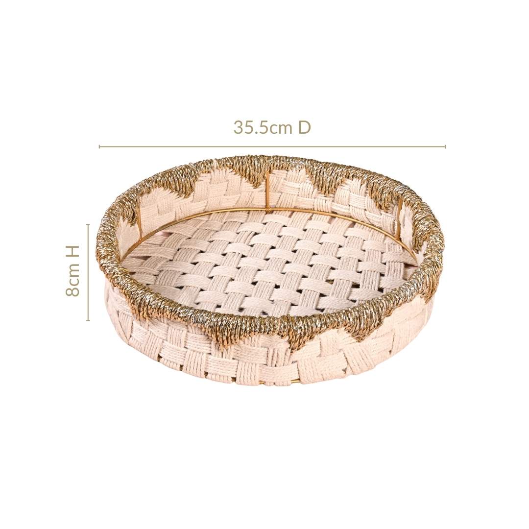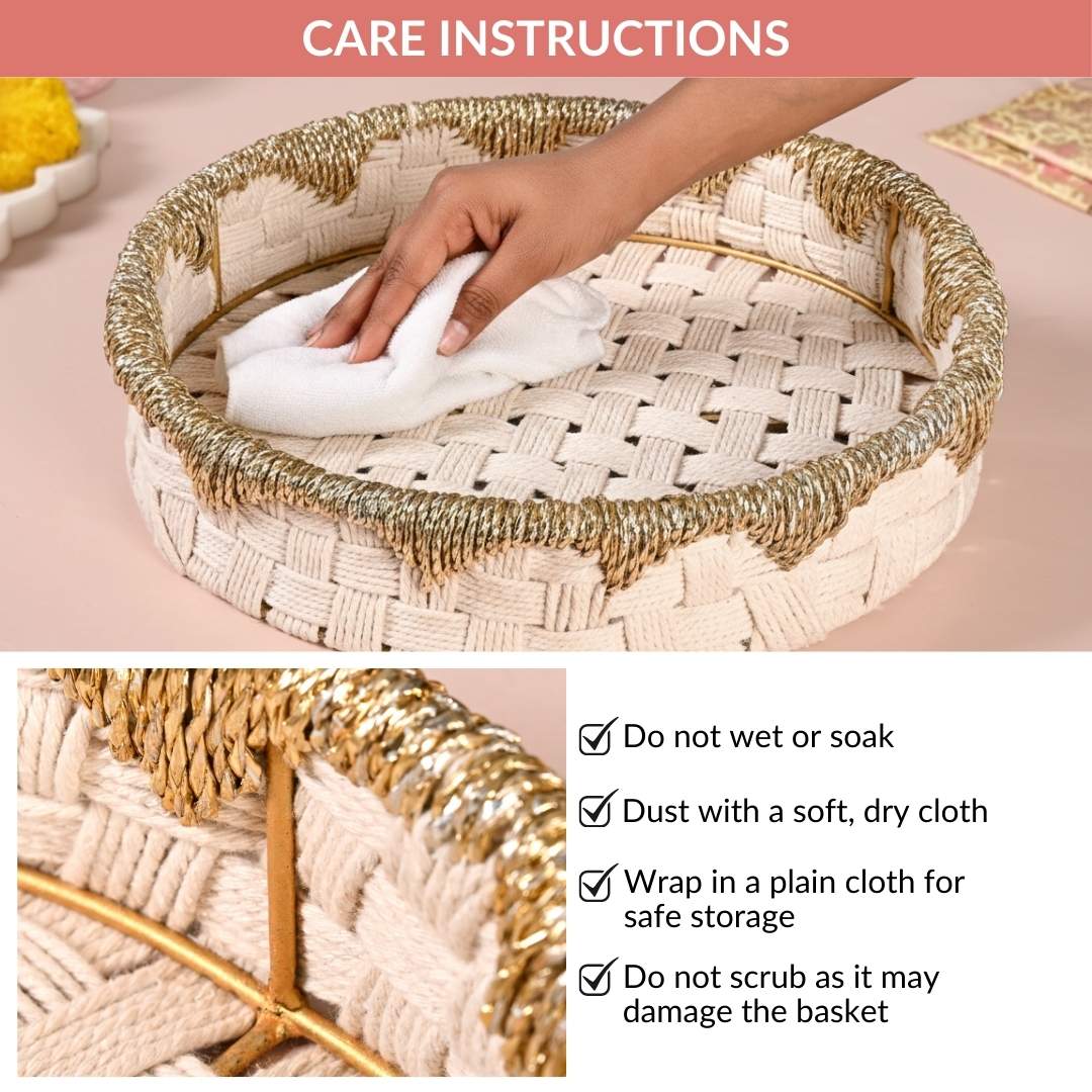 Design: This handwoven basket features a sturdy round silhouette crafted in off-white cotton yarn, highlighted with elegant woven gold detailing for a refined, handcrafted look that adds subtle warmth and sophistication to your storage space.
