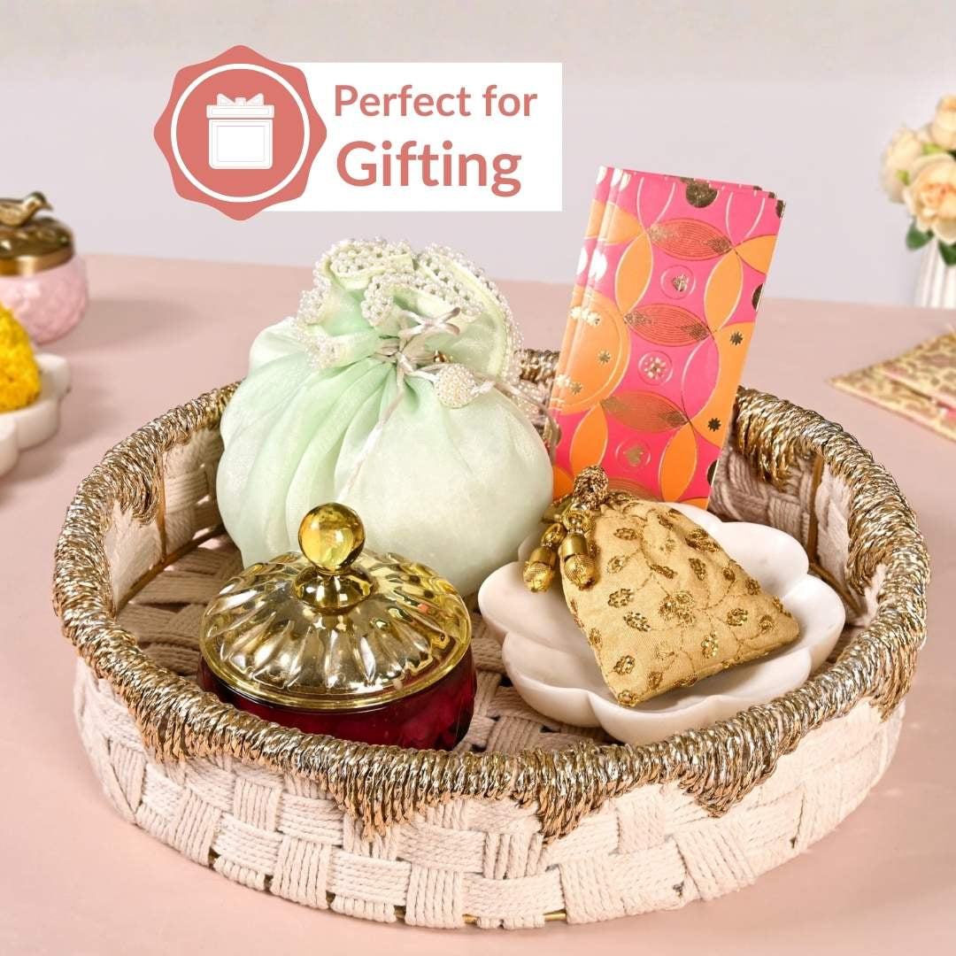 Benefits: Designed with an iron frame for enhanced strength, this storage basket and organiser offers versatile storage. Ideal for trousseau collections, Holi celebrations, or daily use, it blends functionality with handcrafted charm.