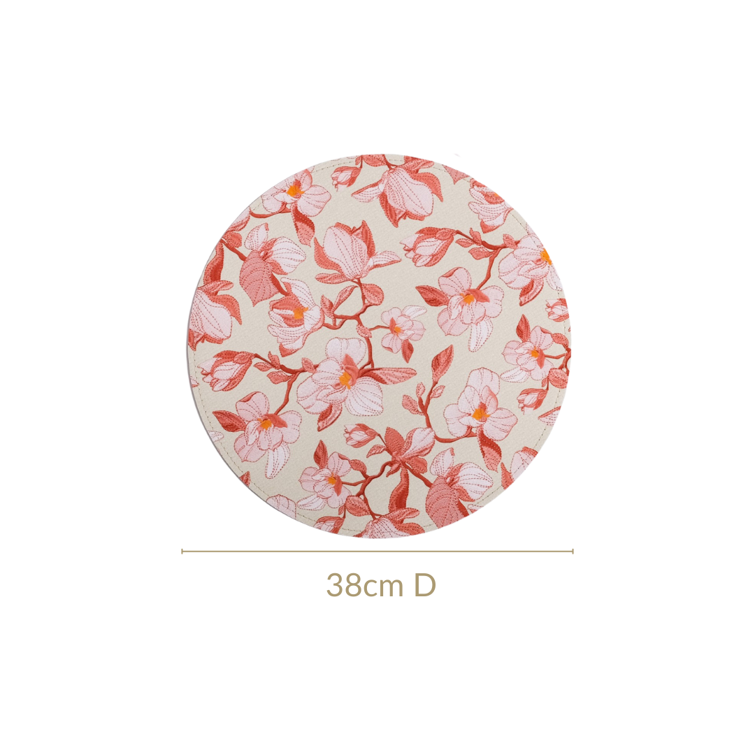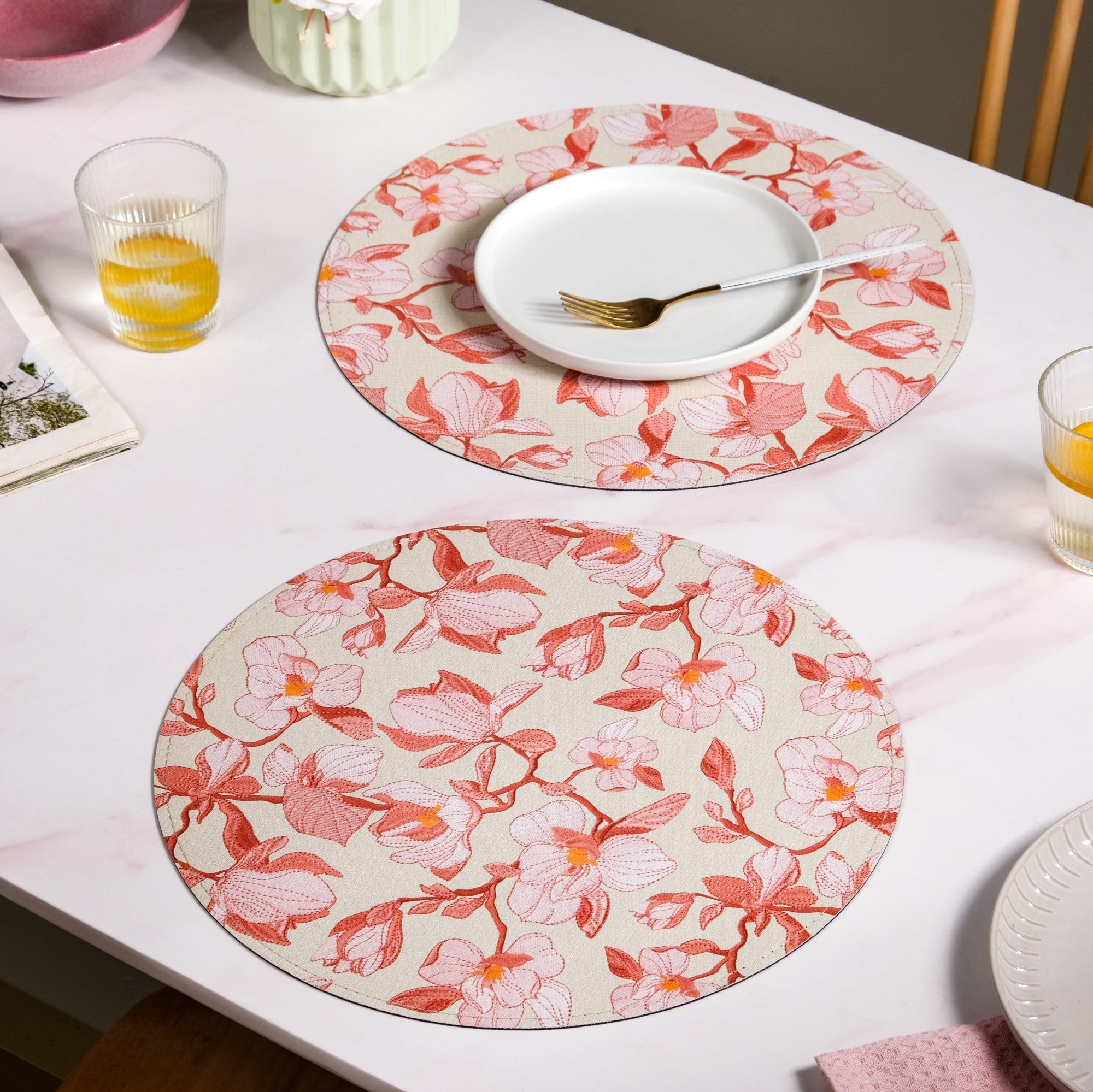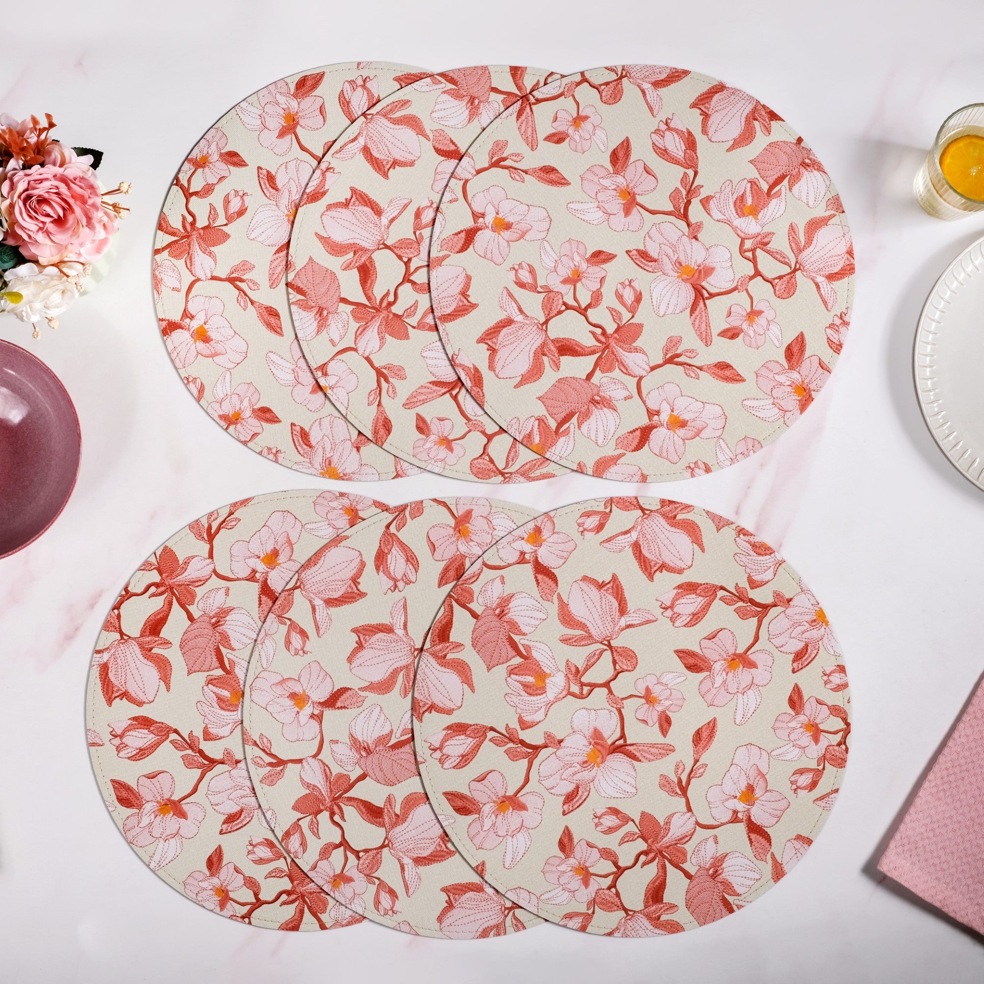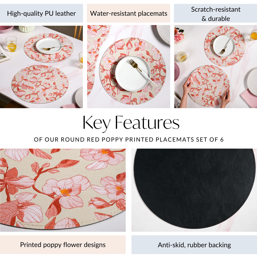 Design: Each placemat in this table mat set features a unique, round silhouette adorned with a vibrant pink and red poppy print on a cream-coloured base. This artistic design gives these dining table placemats a modern yet timeless appeal, making them eye-catching and practical in equal measure. Designed to provide the utmost convenience, each table mat has an anti-skid rubber back, ensuring they stay firmly in place and providing an ergonomic solution.