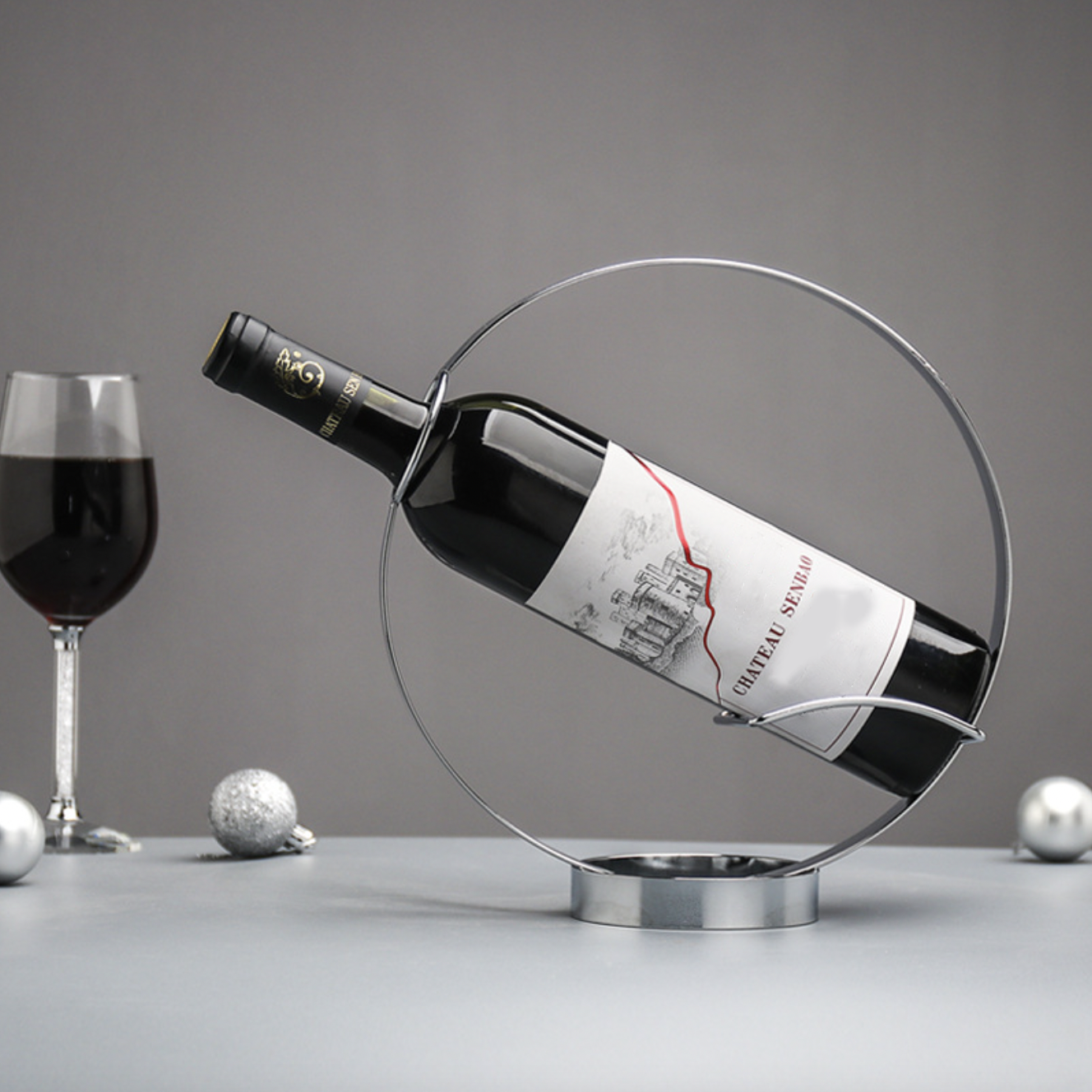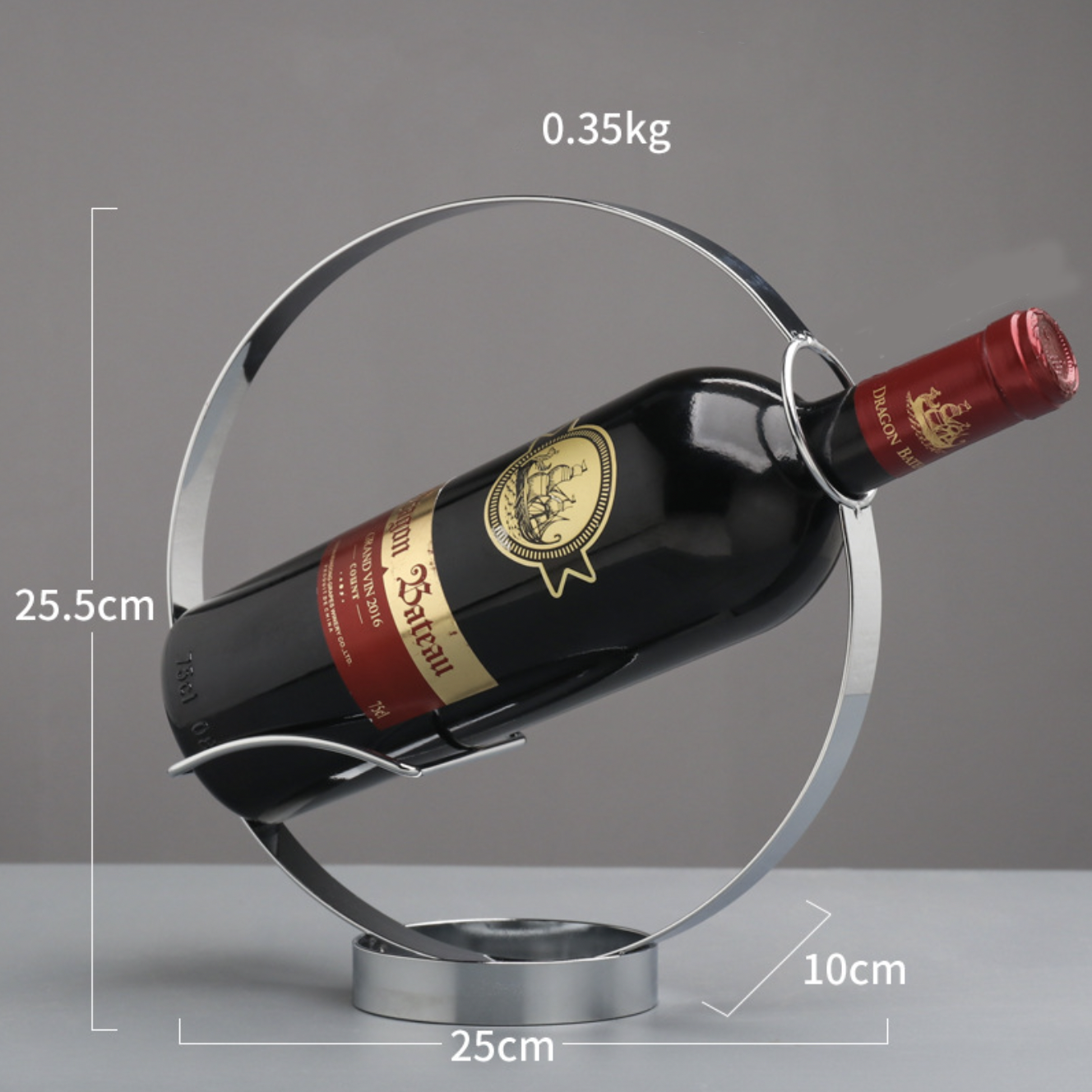 Uniquely shaped wine rack made of sturdy metal and in a stunning silver shade. The round wine rack can nicely hold a bottle of wine and will look great in any area - kitchen or bar. The wine rack is just the right amount of decorative and practical and works great as a gift.