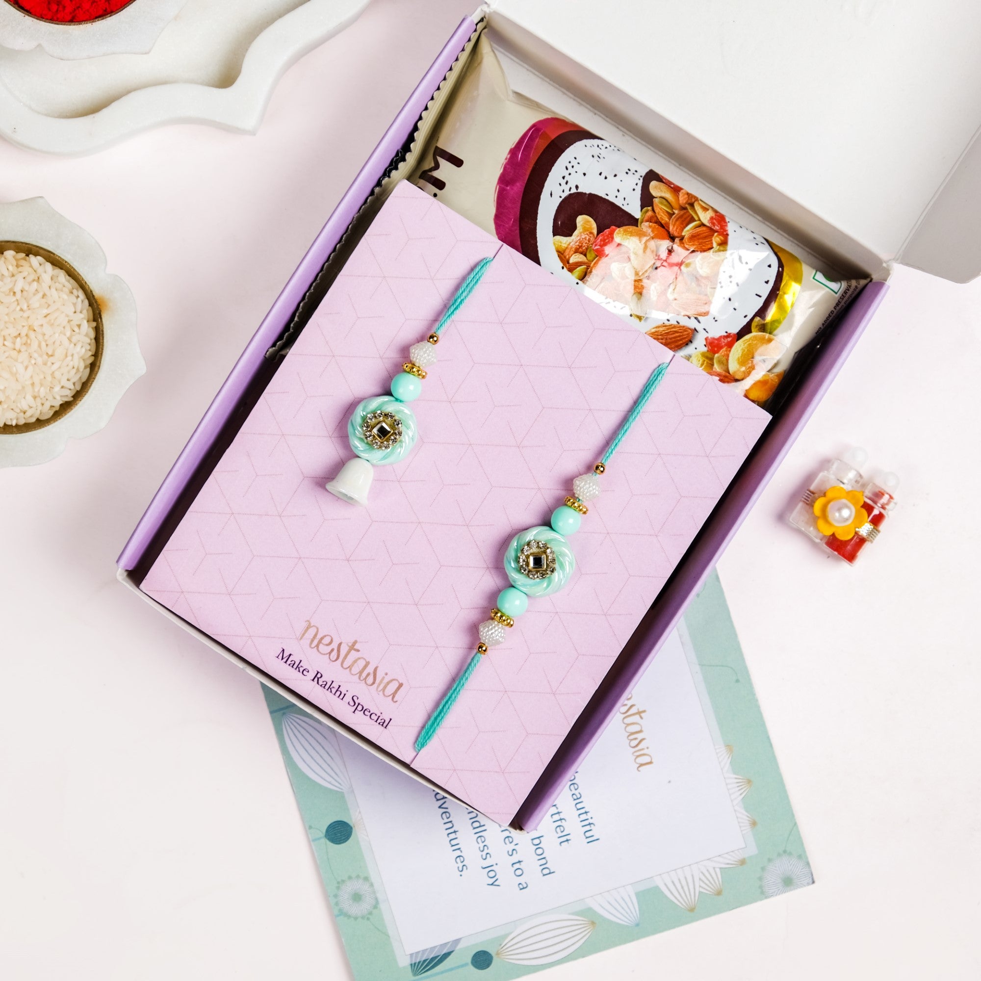 Celebrate your bond with a touch of royalty and pastel elegance with this rakhi set! The soothing mint green tones, paired with gold and white embellishments, add a regal touch. Whether your sibling prefers traditional or modern aesthetics, this rakhi strikes the perfect balance. It comes with soft braided threads for comfortable wear, and premium detailing that makes it unforgettable. Its mint green circular motif is surrounded by tiny crystals and a reflective gem, symbolising love and protection. Each set includes 1 rakhi, 1 lumba, 1 roli-chawal bottle, and 1 packet of dry fruits for the complete festive experience.