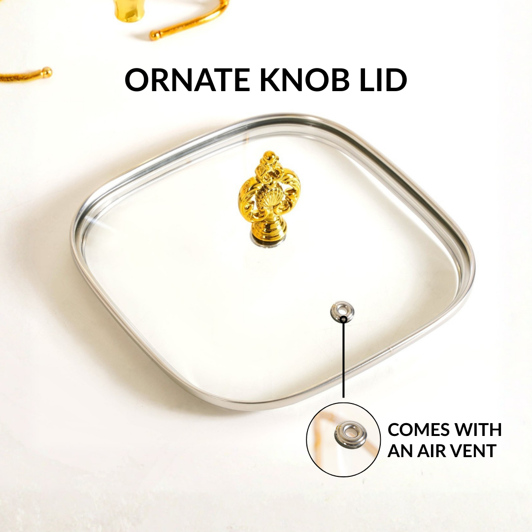 Design: This dispenser features a crystal-clear body made of high-quality borosilicate glass that showcases the vibrant colours of your drinks. It sits securely in a sleek, golden metal raised stand that adds a touch of sophistication. The matching golden tap and the decorative, ornate knob on the lid create a regal look that stands out in any room.