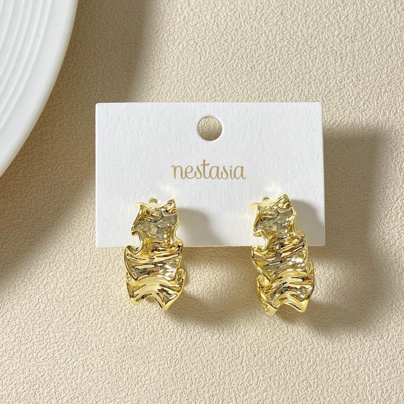 Radiating a quiet sophistication, these gold J hoop earrings effortlessly blend modern style with timeless charm. Inspired by the dynamic beauty of movement, their ruched texture captures the essence of fluidity, offering a structural twist on the classic hoop design. The warm gold tone adds a touch of luxurious elegance, making these earrings a versatile piece for any occasion. With their refined yet bold presence, they embody a sense of grace and contemporary allure.